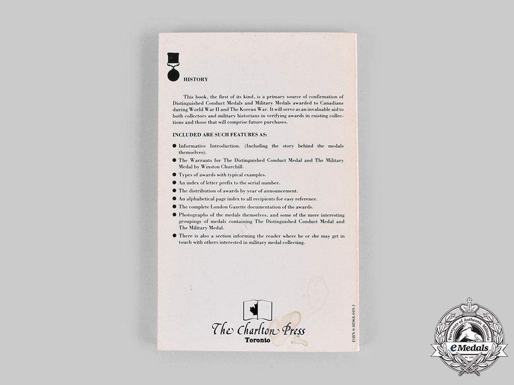 This is a well-preserved edition of “The Canadian Medal Rolls: Distinguished Conduct and Military Medal (1939-45 & 1950-53)”, by Martin Ashton. It is constructed of a white card stock binding, with the exterior of the cover bearing full-colour images of the applicable decorations, circumscribed by author and title, while the reverse of the exterior features a point-form list of content. The interior content consists of 129 white paper pages featuring lists of medal recipients, including unit information. It also includes five black-and-white photographs of notable recipients of the decorations. The book was published in 1983 by The Charlton Press of Toronto, Ontario. It measures 133 mm (w) x 212 mm (h). Some creasing and material fatigue is evident, but the book is in an overall better than very fine condition.