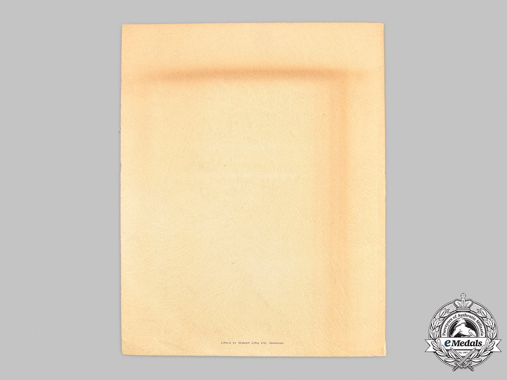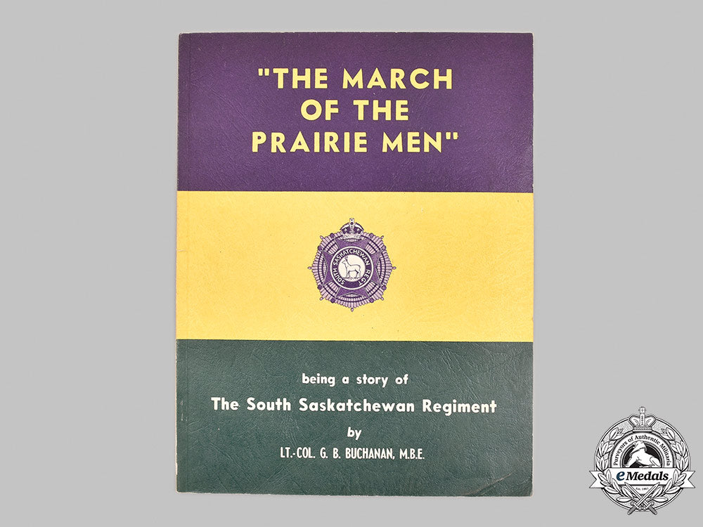 Softcover, entitled " "The March of the Prairie Men" being a story of The South Saskatchewan Regiment", by Lieutenant Colonel George B. "Buck" Buchanan, M.B.E., lithographed by Midwest Litho Ltd. of Saskatoon, Saskatchewan, published in 1957 at its original price of $3.00. As noted at the front of the book: "These books may be obtained from the S. Sask. R. Orderly Rooms at Weyburn and Estevan, Saskatchewan". It begins with a note on the History of the Regiment by Buchanan, followed by a Forward by Major General H.A. Young, C.B., C.B.E., D.S.O., C.D. and dated June 25, 1957 at Ottawa, and a List of Abbreviations. The Regiment achieved twelve Battle of Honours: two in the First World War (Arras 1917, Hill 70) and ten in the Second World War (Dieppe, Bourguebus Ridge, The Laison, Falaise, Foret de la Londe, Antwerp-Turnhout Canal, The Scheldt, The Hochwald, The Rhine, Oldenburg). As stated by the author: "This book is most humbly dedicated to the men of the South Saskatchewan Regiment who gave their lives in two great conflicts with the reverent hope that they did not die in vain. We shall not forget them." The book is divided into fifteen chapters: I - The Early History of the South Saskatchewan Regiment; II - World War II - Mobilization and Early Training, 1939-40; III - England - Training Period - 1941-1942; IV - Dieppe - Training Period; V - Advanced Training Period; VI - Caen to Falaise; VII - The Chase; VIII - Belgium; IX - Holland; X - Holland - Nijmegen Salient; XI - Germany; XII - Occupation Duties; XIII - Holland - The Road Home; XIV - Dispersal Point - Home; XV - Return to Dieppe. It concludes with an Epilogue, a five page Honour Roll, a Summary of Casualties - War 1939-45, a List of Honours and Awards for the Second World War, a List of Movement and Battle Dates on the Continent, and a Chart of Organization, Perpetuations and Battle Honours. The book contains 84 pages of text, accompanied by multiple line graphics and photographs, plus a map of the Western European theatre (with the movements of the regiment marked on it), printed in black ink, on a coated white paper stock, the cover printed in three colour inks on a cream-coloured card stock, perfect bound, measuring 217 mm (w) x 279 mm (h) x 6 mm (d). It exhibits spotting on the lead page, creasing at the lower right on the front cover and some pages, along with a highlight present on the back cover from storage, however, the majority of pages within remain unaffected. A terrific resource book for Second World War collectors and researchers of The South Saskatchewan Regiment. Very fine.