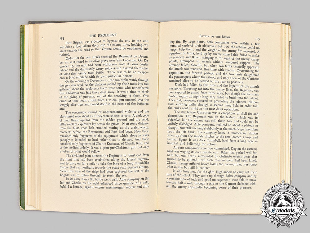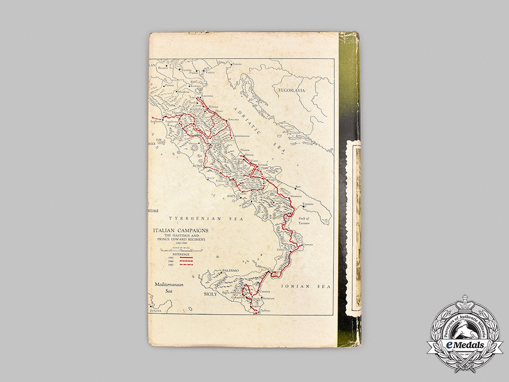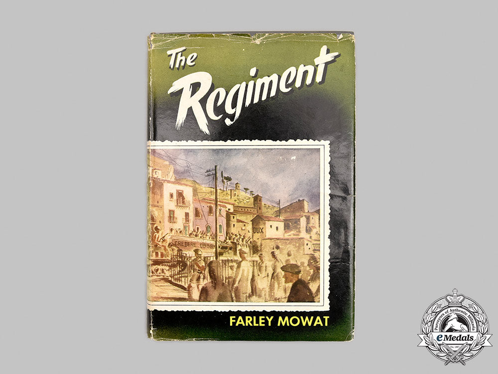 Hardcover, steel gray cloth cover, insignia of The Hastings and Prince Edward Regiment on the front cover and the text on the spine in gold-coloured ink, entitled "The Regiment" (The Hastings and Prince Edward Regiment) by Farley Mowat, First Edition of October 1955, published by McClelland and Stewart Limited of Toronto, printed and bound by the T.H. Best Printing Company Limited of Toronto. As stated by J.D. MacFarlane, Executive Editor of the Toronto Telegram on the dust jacket: "...Farley Mowat's "The Regiment" is a new kind of regimental history - at least new to me. Factual it is. Dull it certainly is not. Mowat has taken the bare bones of regimental history and built around them a magnificent documentary of a Canadian regiment, a story that stirs and shakes and sometimes shames the Canadian reader. "The Regiment" is the Hastings and Prince Edward Regiment, with headquarters in the quiet little Ontario bay town of Picton. As the name implies, the regiment draws its men from to counties of Hastings and Prince Edward and the unit's nickname 'Plough Jockeys' make it obvious that many of them came off the farm to fight. This Is an infantry regiment and this is a story of infantrymen. Mowat was the battalion's intelligence officer and he writes with the authority of a man who was there, with the talent of a fine craftsman as well as soldier, with the affection and sympathy and understanding born of pride in his fellows. Mowat didn't just write from records and memory. He went back, in the quiet aftermath of the wreckage of war, and retraced the footsteps of this regiment of infantry - in Britain, in Sicily, in Italy, in northwest Europe. His masterful handling of the descriptive pieces, of atmosphere bear witness to this research. Don't' forget this is a true story, or at least as true as Mowat can make it. Its characters are real, its situations existed, its action happened. So it's not all glory, not by any means. The book shows its greatest strength, and the unit's greatest strength of character, in survival from defeat. Read it all...lest you forget." It begins with a Foreword by the author dated September 1955, followed by a Table of Contents, and a Prelude (The Years Before). It contains twenty-four chapters: 1 - Phoenix in Uniform; 2 - The Tiger in Their Midst; 3 - "Cook's Tour"; 4 - "The Waiting Years"; 5 - The Hour Strikes; 6 - The Sands of Sicily; 7 - Death Valley; 8 - Montgomery's Mountain Goats; 9 - The Flavour of Defeat; 10 - A Trap Unsprung; 11 - Interlude in the Apennines; 12 - The River of Blood; 13 - Battle of the Bulge; 14 - Winter Front; 15 - The Road to Rome; 16 - The Regiment at Rest; 17 - The Gothic Line; 18 - Gateway to the Plains; 19 - Across the Rubicon; 20 - Betrayal; 21 - Operation Chuckle; 22 - The Battle Without End; 23 - Resurrection; 24 - The End in View. It concludes with an Aftermath (The Years Ahead) and a two page Glossary. The book contains 332 pages of text and line drawn maps, printed in black ink, on an off-white paper stock, measuring 155 mm (w) x 234 mm (h) x 30 mm (d). It exhibits light wear with light tears on the edges of the dust jacket, along with one light smudge on the inside endpaper, however, the text of the book remains pristine. Better than very fine.
