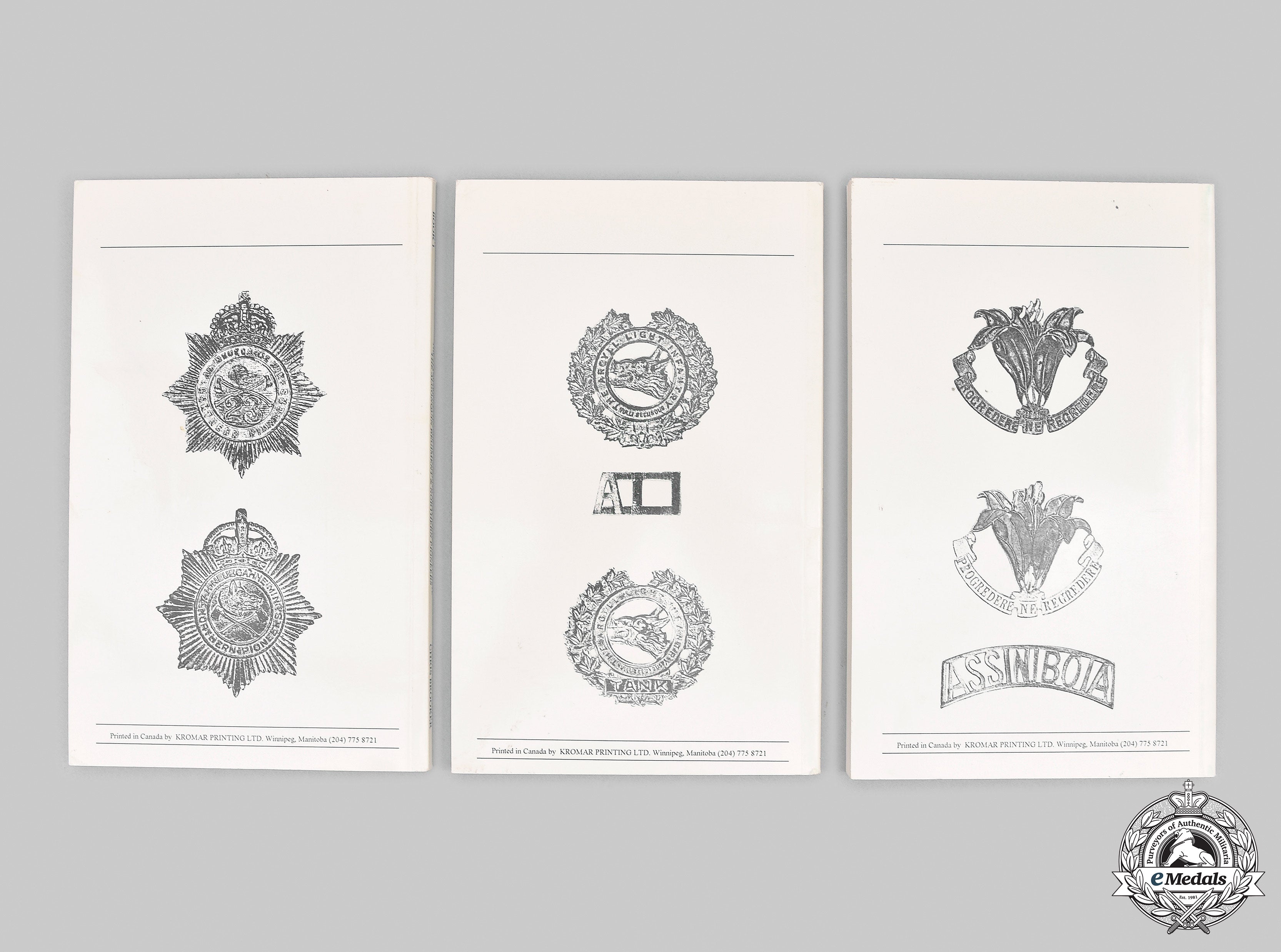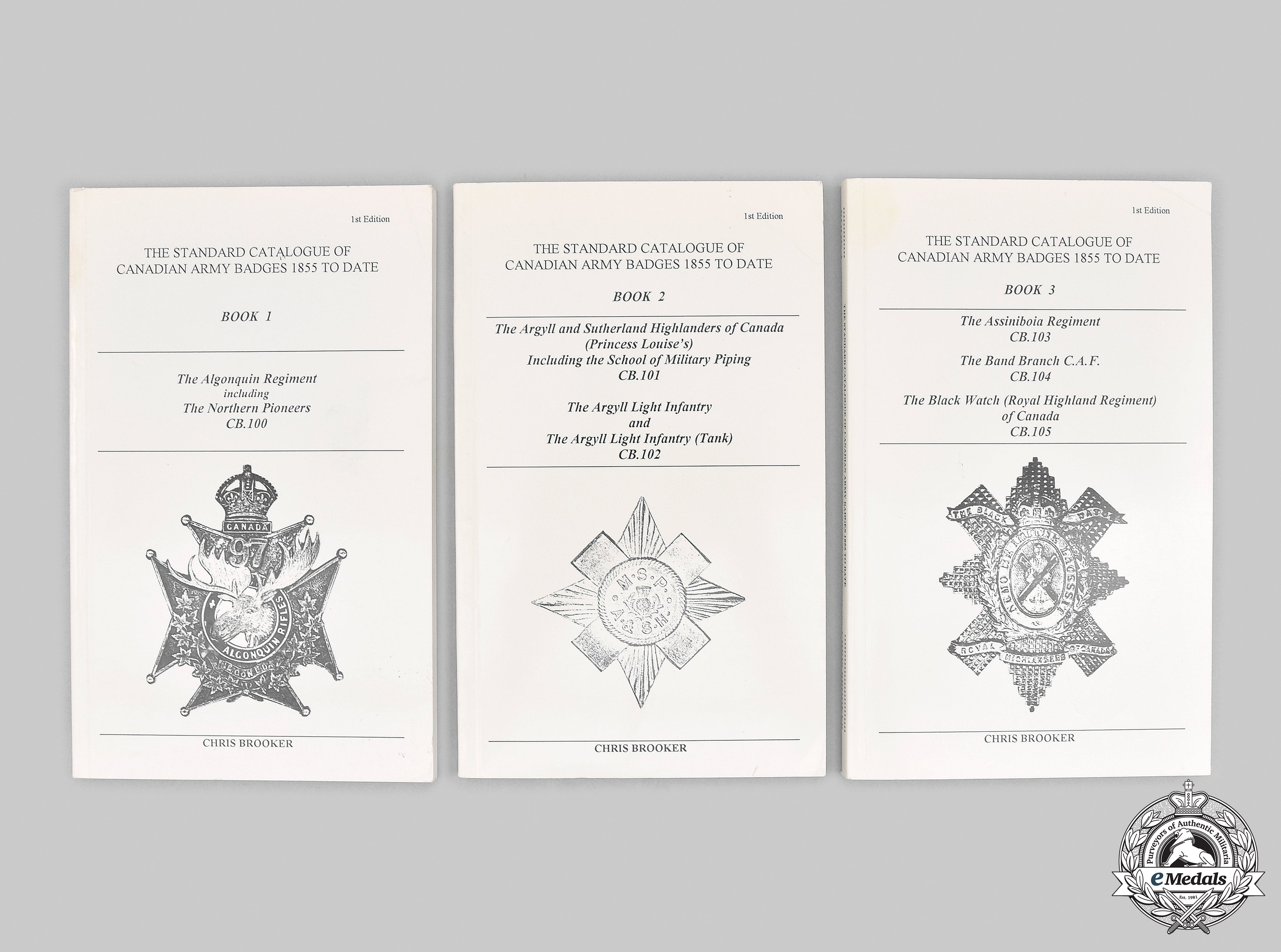 Softcover, each of the three books entitled "The Standard Catalogue of Canadian Army Badges 1855 to Date", by Chris Brooker, all three are First Editions. Each book begins with a Foreword, followed by an Introduction, along with sections labelled The Numbering System, Some Notes on the Numbering System, Uniforms and Accouterments, Cap Badges, The Manufacture of Die Struck Badges, Counterfeits and Copies, Cloth Shoulder Titles, Illustrations, along with a history of the regiment(s) featured. The books are brimming with descriptive, in-depth text, accompanied by photographs of the various cap badges, collar badges, shoulder titles, patches, pins, broaches, belt plates, etc. worn by the unit, be they in cloth or metal.
