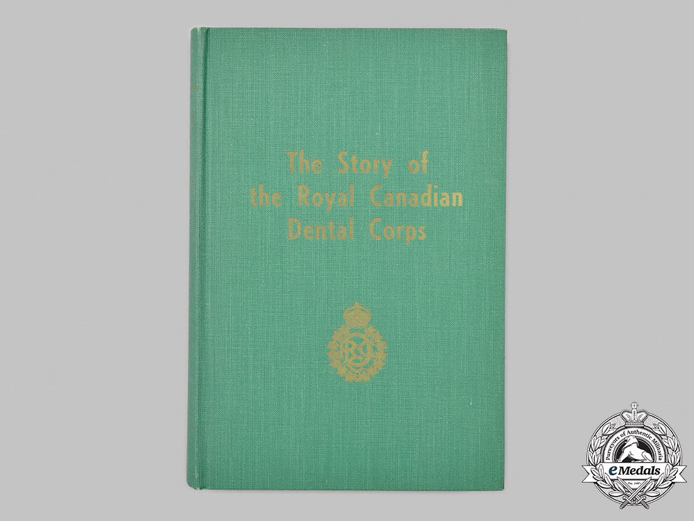Hardcover, emerald green cloth cover, the text on the front cover and spine in a gold-coloured ink, entitled "The Story of the Royal Canadian Dental Corps", by Lieutenant-Colonel Harold McGill Jackson, M.B.E., E.D., published by the Industrial Shops for the Deaf in Montreal, Quebec in 1956. It includes thirteen black and white photographs (as the Frontispiece, between pages 80-81 (2), 112-113 (2), 174-175 (2), 236-237 (2), 268-269 (2), 300-301 (2)), along with three maps in black inserted at three locations, between pages 146-147 ("The United Kingdom 1940-1945"), 212-213 ("The Dental Companies, Italy, 1943-1945") and 346-347 ("The Dental Companies, North-West Europe"). The book begins with a List of Illustrations and Maps, followed by a Foreword by The Director General of Dental Services, Brigadier E.M. Wansborough (dated November 8, 1956), an Introduction and a Table of Contents. The book contains twenty-six chapters: 1 - Military Dentistry and the Dental Surgeons of the C.A.M.C.; 2 - The Great War of 1914-19; 3 - The Post-War Period; 4 - The Reorganization of 1935; 5 - Reorganization in 1939 and the Outbreak of War; 6 - Organization in Canada; 7 - Dental Headquarters and its Early Problems; 8 - Keeping Pace with Expanding Services; 9 - Training: Demobilization; 10 - The District Companies; 11 - The District Companies (ii); 12 - The 1st Divisional Dental Company, C.A.S.F.; 13 - Intermediate Overseas Base and Headquarters; 14 - Companies Prepare for Action; 15 - More Companies Are Altered; 16 - Dental Service with the R.C.A.F.; 17 - Dental Service with the R.C.A.F. (ii); 18 - With the Royal Canadian Navy; 19 - North Africa, Sicily and Italy; 20 - Preparations for Operation "Overlord"; 21 - Normandy; 22 - North-West Europe; 23 - Germany; 24 - Through to the Finish; 25 - Special Forces; 26 - The Post-War Corps. It concludes with fifteen Appendices. The book contains 494 pages, printed in black ink, the text and maps on an off-white paper stock, the thirteen pages of black and white photographs on a semi-gloss white paper stock, measuring 157 mm (w) x 235 mm (h) x 38 mm (d). Near extremely fine.