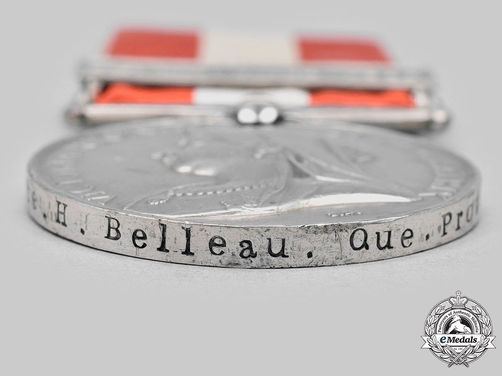 Footnote: Private Honoré Belleau, Quebec Provisional Battalion is shown on the roll of the 97 man Quebec Provisional Battalion (AKA The Provisional Battalion of Quebec), as being posted to the Jesuit Barracks in Quebec City from May 23rd to 28th, 1870, with an "attack from (the) enemy expected, in readiness, waiting for orders" and is listed on page 240 of the "Canada General Service Medal Roll, 1866-70" by John Thyen. He is documented as being entitled to and having received the 1870 Fenian Raid clasp, not the 1866 version that accompanies his medal.