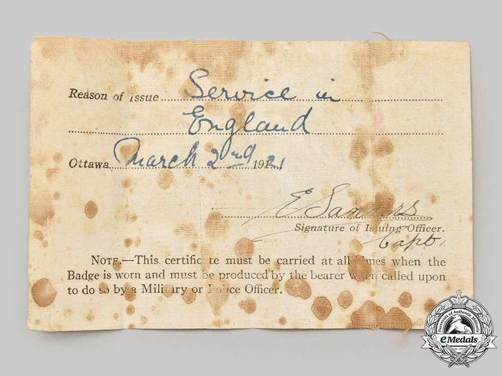 (L. H. LUCK. V.A.D.). Naming is officially impressed. Dark patina, very light contact, original ribbon, near extremely fine. Accompanied by the "Certificate Issued with the War Badge", inscribed in blue ink "Class C", "No. 85406", named to "Lillian Luck / V.A.D.", for "Service in England", dated at "Ottawa, March 2nd 1921", measuring 130 mm (w) x 82 mm (h), soiled.