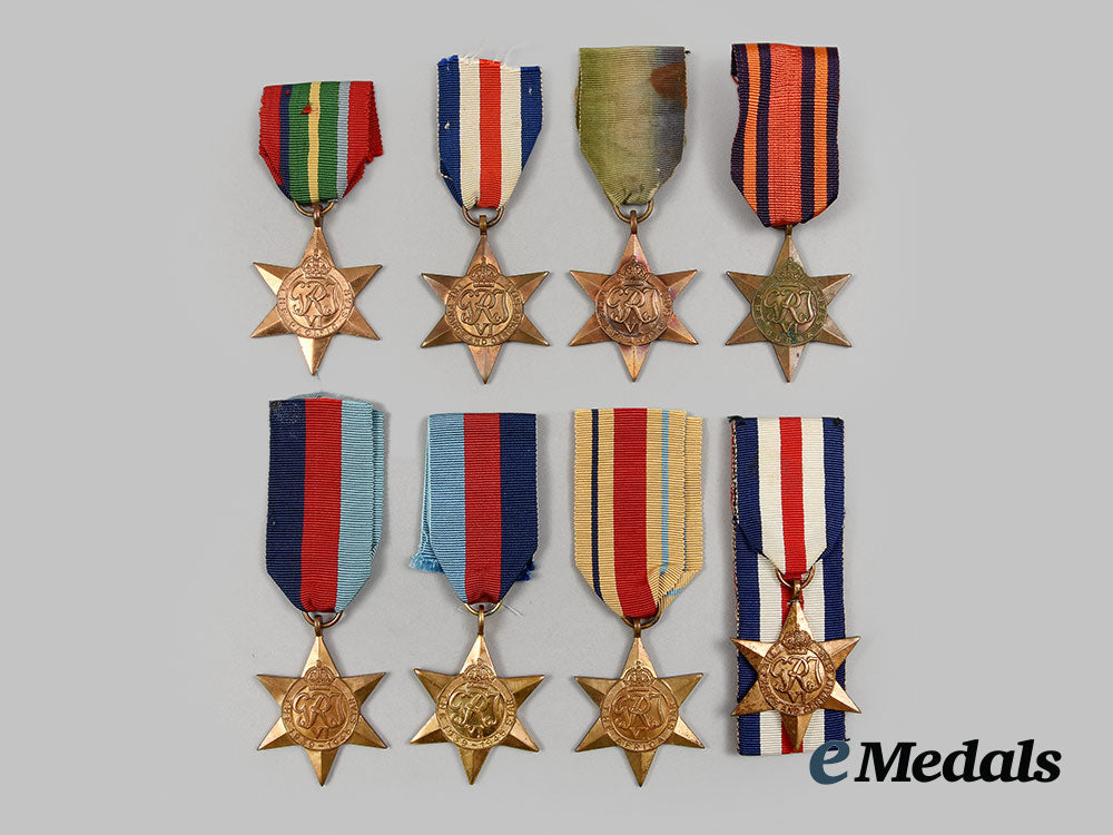 In bronze, measuring approximately 38 mm (w) x 44.5 mm (h) each, four with original ribbons, four with replacement ribbons, the Atlantic Star ribbon exhibiting extensive soiling, one of the 1939-1945 Stars court-mounted, ranging from fine to near extremely fine.