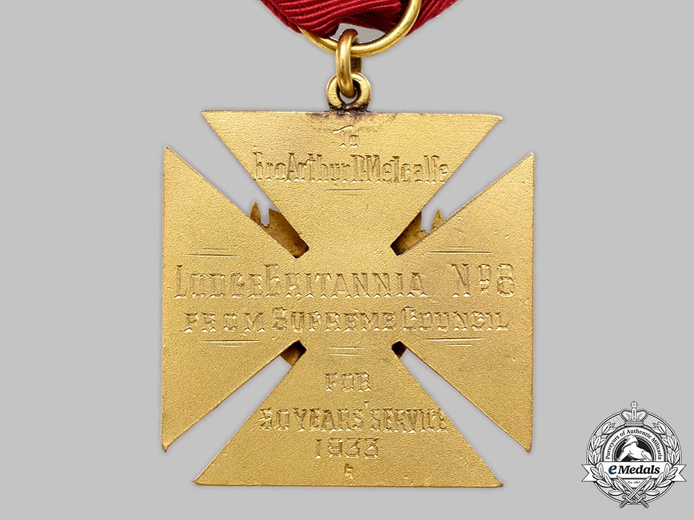 3. Sons of England Veteran's 50 Years' Service Medal (two-piece construction, in bronze gilt with red, white and blue enamels, hallmarked and engraved "To Bro Arthur D. Metcalfe / LODGE BRITANNIA No. 8 / FROM SUPREME COUNCIL / FOR 50 YEARS' SERVICE 1933" on the reverse, measuring 35.7 mm (w) x 40.2 mm (h) inclusive of its integral suspension, original ribbon, suspended from a hanger with pinback and inscribed ".S.O.E.", incorporating a sub-hanger inscribed "VETERAN", intact enamels).