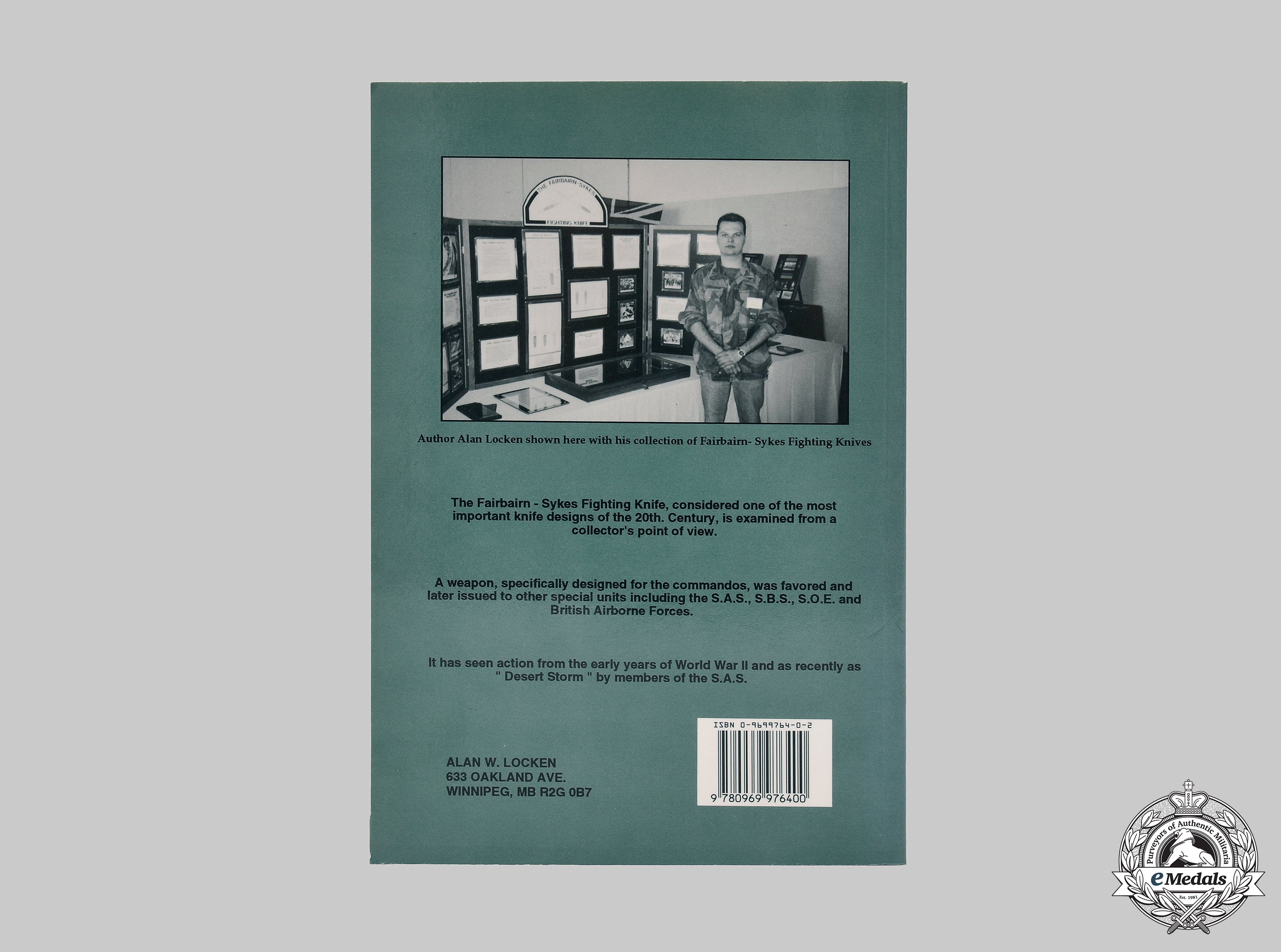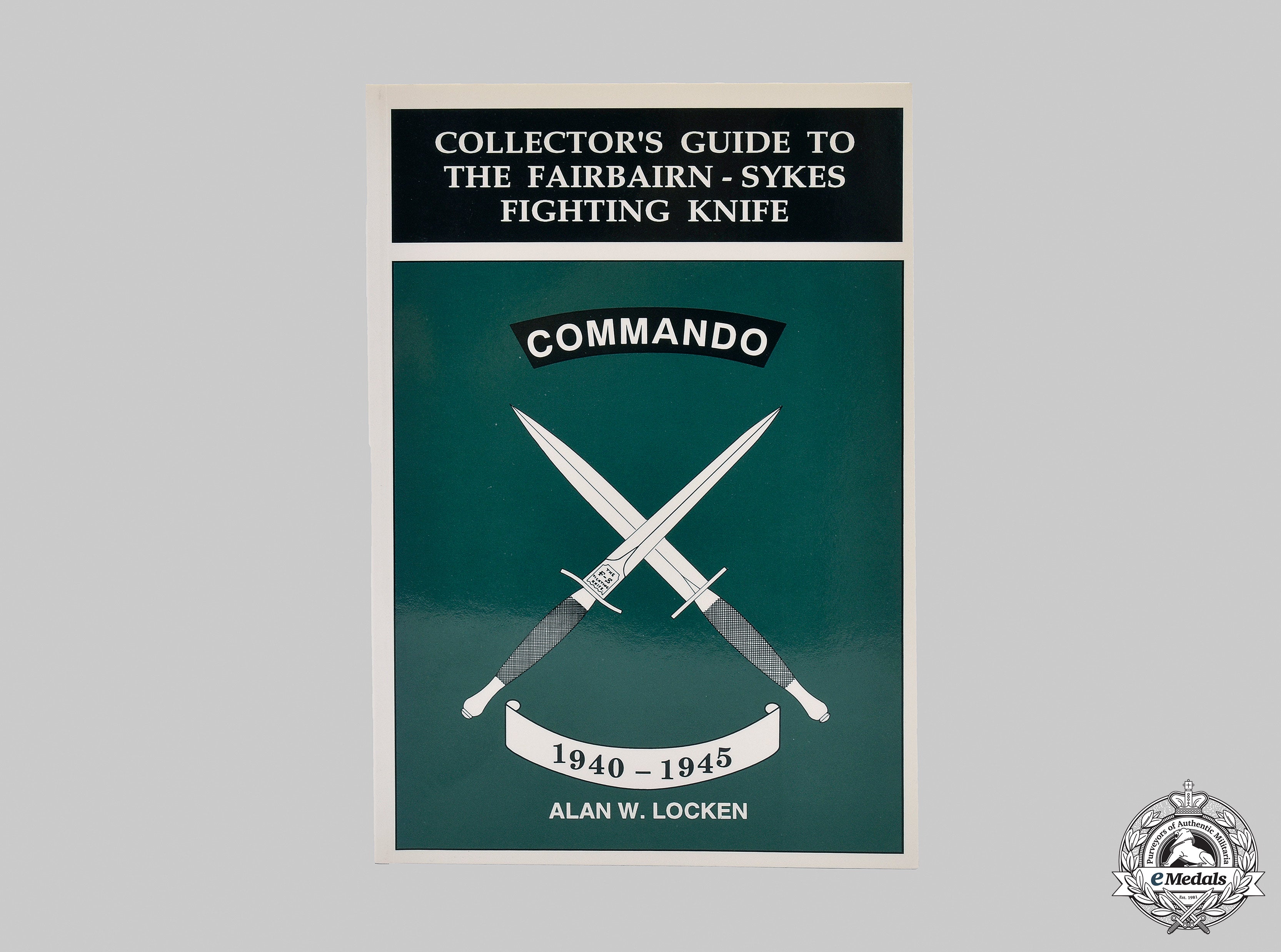 Softcover, entitled "Collector's Guide to the Fairbairn-Sykes Fighting Knife" by Alan W. Locken of Winnipeg, Manitoba, published and copyrighted by the author, book production by Bunker to Bunker Books of Winnipeg, printed and bound by Hignell Printing Limited of Winnipeg in 1995, ISBN 0-9699764-0-2. As stated on the back cover: "The Fairbairn-Sykes Fighting Knife, considered one of the most important knife designs of the 20th Century, is examined from a collector's point of view. A weapon, specifically designed for the commandos, was favoured and later issued to other special units including the S.A.S., S.B.S., S.O.E. and British Airborne Forces. It has seen action from the early years of World War II and as recently as "Desert Storm" by members of the S.A.S." The book begins with a Table of Contents, followed by a Quick Visual Index (Q.V.I.), a Foreword by the author and a two page Introduction. It is divided into sixteen sections: Historical Background; The Innovators (William Ewart Fairbairn and Eric Anthony Sykes); F-S Nomenclature; Assembly of the Knife; Early Issue Knives; The First Pattern F-S Knife; The Second Pattern F-S Knife; The Third Pattern F-S Knife; Beaded and Ribbed F-S Variant; Smooth Hilted of "Unribbed" F-S Variant; Wooden Hilted F-S Variant; Ribbed and Roped F-S Variant; Manufacturing, Ownership and Other War-Era Markings; Post-War F-S Style Knives; Avoiding the Fakes; Protecting Your Collection. It concludes with a Glossary and a Bibliography. The book contains 104 pages of text, along with being fully illustrated through the use of photographs and detailed diagrams, printed in black ink, on a white paper stock, the cover on a white card stock, measuring 152 mm (w) x 228 mm (h) x 7 mm (d). Near extremely fine.