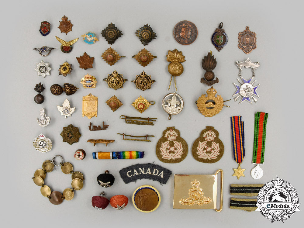 1. forty-nine Canada, United Kingdom items: medals, miniature medals, cap badges, collar tabs, shoulder titles, shoulder flashes, sleeve badges, slip-on rank insignia, lapel badges, pips, participation medals, rosettes, ribbon bar, belt buckle, among others. In sterling silver, bronze or white metal, eleven with enamels, two with embedded glass stones, a few are embroidered, in various sizes, with an assortment of attachments;