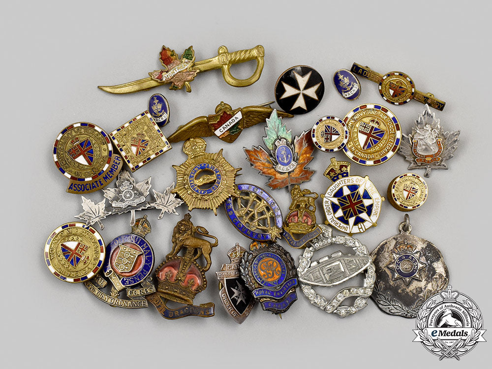 In sterling silver or bronze, twenty-three incorporating enamels, the Canadian Armoured Corps badge with multiple glass stones, in various sizes, thirteen with a pinback, seven with a screwback, one with a ring suspension, the button with an intact loop, three missing their pinbacks, all but two with intact enamels, ranging from near fine to extremely fine.