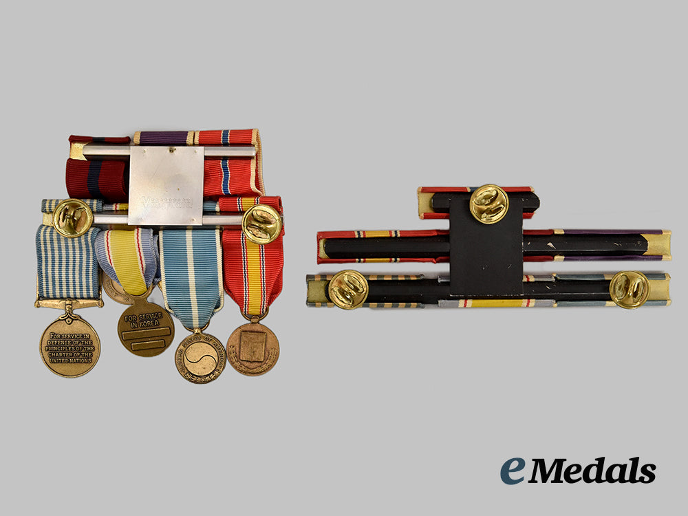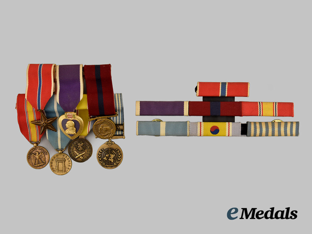 1. Miniature Group of Seven: Bronze Star Medal, Purple Heart, United States Marine Corps Good Conduct Medal, National Defense Service Medal, Korea Service Medal, Republic of Korea: War Service Medal, United Nations Service Medal for Korea (mounted to a suspension with two push pins).