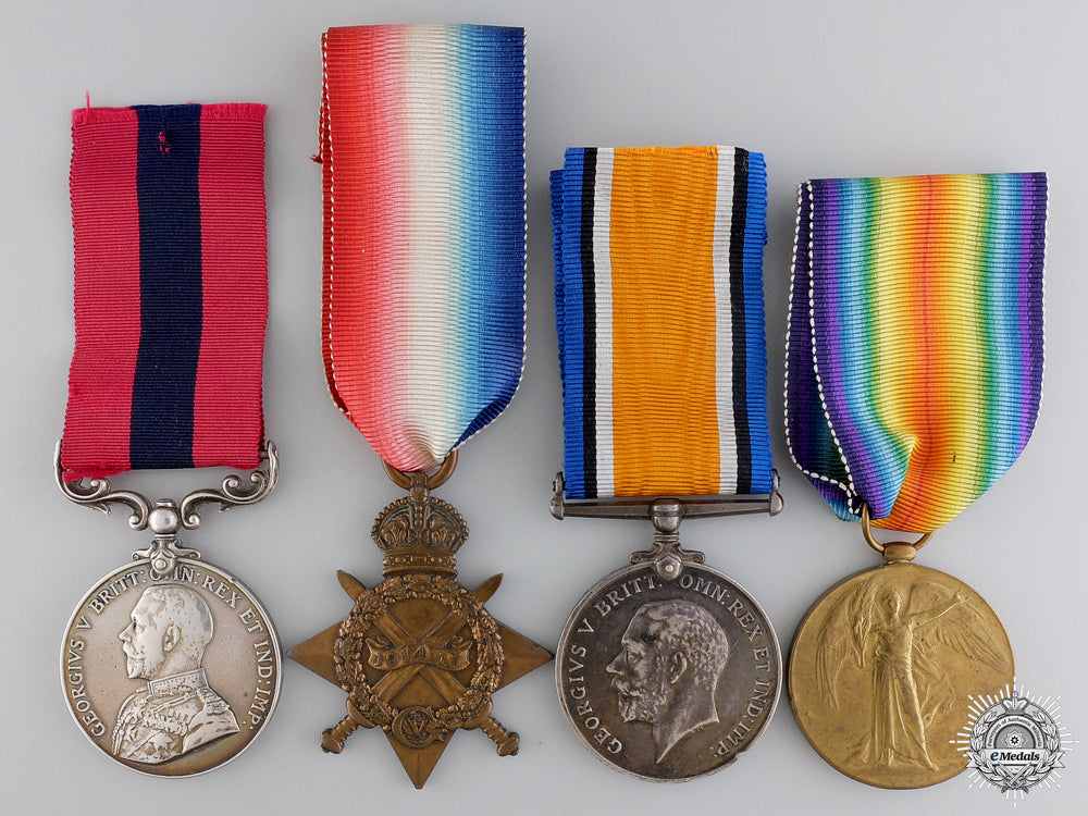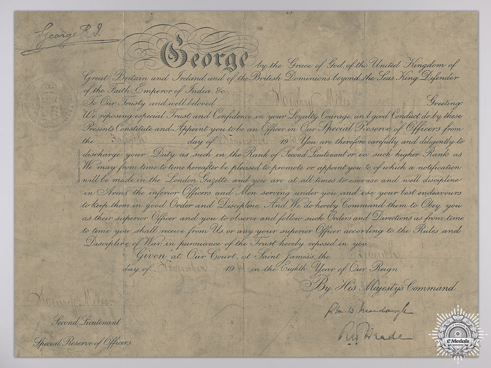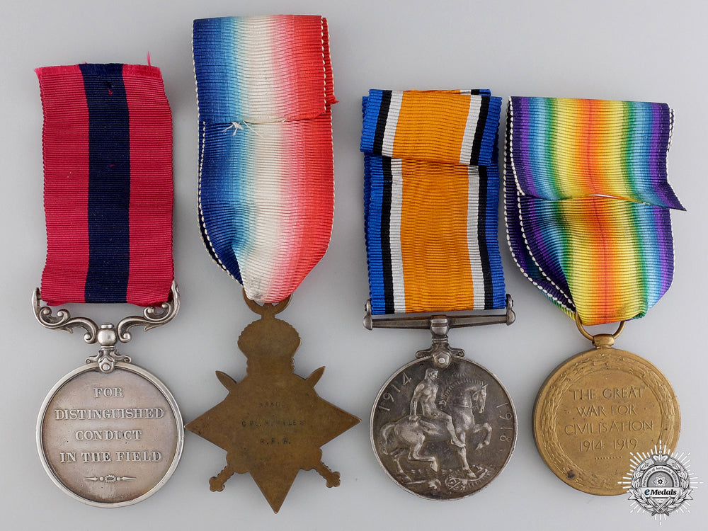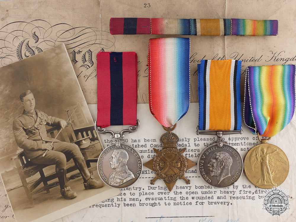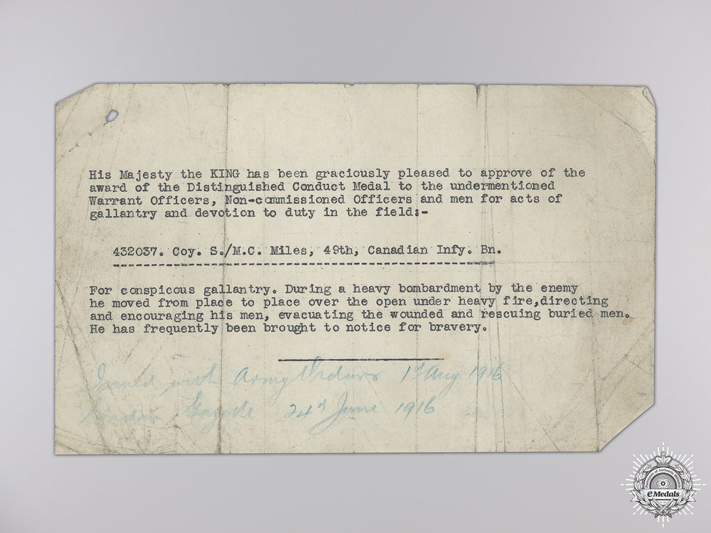 Distinguished Conduct Medal Group to Brothers Henry & George Miles; Lieutenant Henry Miles, Royal Field Artillery: Distinguished Conduct Medal, George V (33300 Cpl H. MILES. 5C. RES: BDE: R.F.A.); 1914-15 Star (33300 CPL. H. MILES R.F.A.); British War Medal (2. LIEUT. H. MILES); and Victory Medal (2. LIEUT. H. MILES). Naming is officially impressed. Un-mounted, dark patina on the BWM, edge nicks, light contact, near extremely fine. Accompanied by their original Ribbon Bar (original lightly soiled ribbons, 12.3 mm x 135 mm, with swing bar pinback), a Postcard of Henry Miles in his Royal Field Artillery Uniform (obverse with a sepia-toned photograph, unaddressed backer, 82 mm x 131 mm), original Appointment Document to the Special Reserve of Officers (dated November 7, 1917, 304 mm x 405 mm, with fold marks, soiled) and a CD containing forty-eight pages with copies of his Index Cards, Attestation Paper, Service Records, Medical Records and Discharge Certificates. Also included is his brother's, Lieutenant Charles Miles, 48th Infantry Battalion, original Distinguished Conduct Medal award notification citation, as it appeared in the Supplement to the London Gazette 29637 of Friday, June 23, 1916.