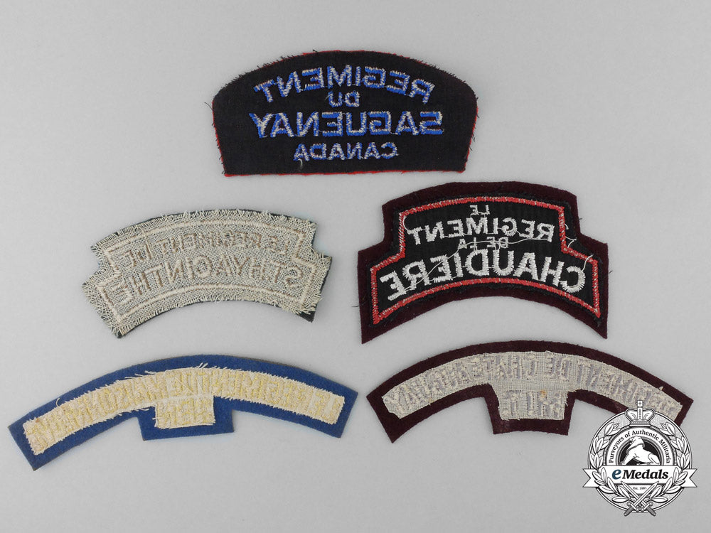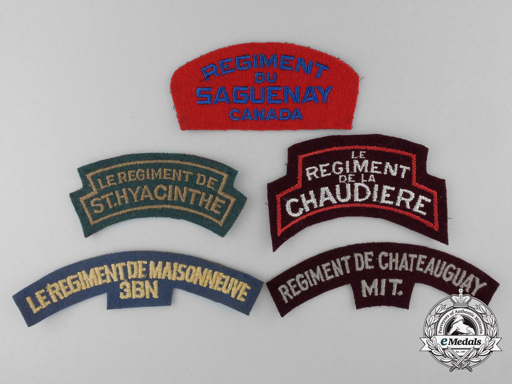Regiment de Chateauguay MIT (gray embroidered lettering on maroon felt, white cotton mesh backer, 37 mm x 136 mm); Le Regiment de la Chaudiere (white embroidered lettering with a red embroidered border on maroon felt, black cotton mesh backer, 48 mm x 105 mm); Le Regiment de Maisonneuve - 3rd Battalion (yellow embroidered lettering on steel blue felt, white cotton mesh backer, 32 mm x 145 mm); Le Regiment de St. Hyacinthe (khaki embroidered lettering and border on green felt, white cotton mesh backer, 38 mm x 105 mm); and Regiment du Saguenay (blue embroidered lettering on red felt, black cotton mesh backer, 50 mm x 110 mm). Ranging from better than very fine to extremely fine.