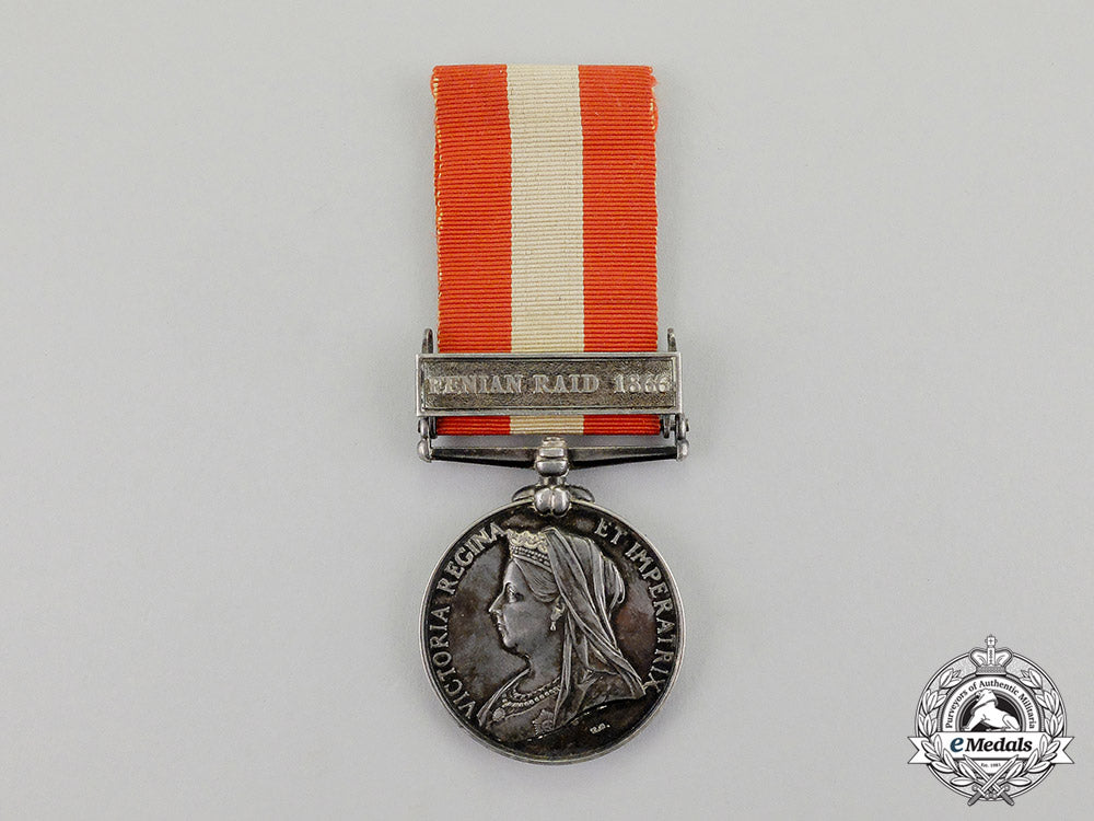 Great Britain. A Canada General Service Medal to Private James Randle, 31st Battalion Grey Infantry, Meaford Rifle Company No. 2, Great Britain; 1 Clasp - FENIAN RAID 1866 (Pte. J. Randle, Meaford R. Co.). Naming is officially impressed. Original ribbon, dark patina, edge nicks, light contact, better than very fine.