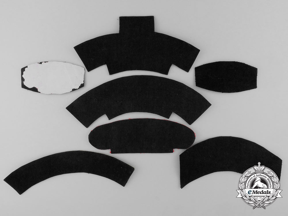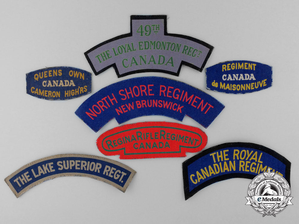 Lake Superior Regiment (blue screen-printed background on gray screen-printed canvas, highlighting the lettering, black backer, 24 mm x 141 mm); 49th Loyal Edmonton Regiment (green lettering and black border screen-printed on gray canvas, black backer, 58 mm x 138 mm); New Brunswick North Shore Regiment (red lettering and blue background screen-printed on white canvas, black backer, 42 mm x 162 mm); Queen's Own Cameron Highlanders (yellow lettering and blue background screen-printed on white canvas, black backer, 36 mm x 70 mm, paint residue on the reverse from previous board mounting); Regiment de Maisonneuve (yellow lettering and blue background screen-printed on white canvas, black backer, 36 mm x 70 mm); Regina Rifle Regiment (green lettering and border along with a red background screen-printed on white canvas, black backer, 39 mm x 118 mm); and Royal Canadian Regiment (yellow lettering, blue background and black border screen-printed on a white canvas, black backer, 39 mm x 115 mm). Ranging from near very fine to extremely fine.