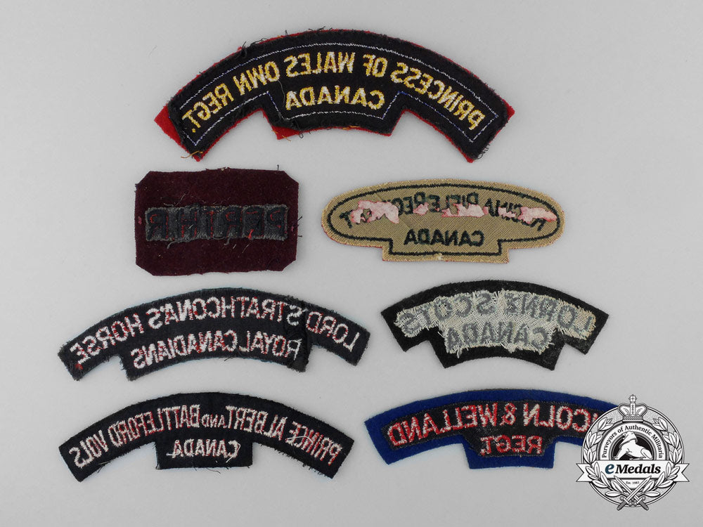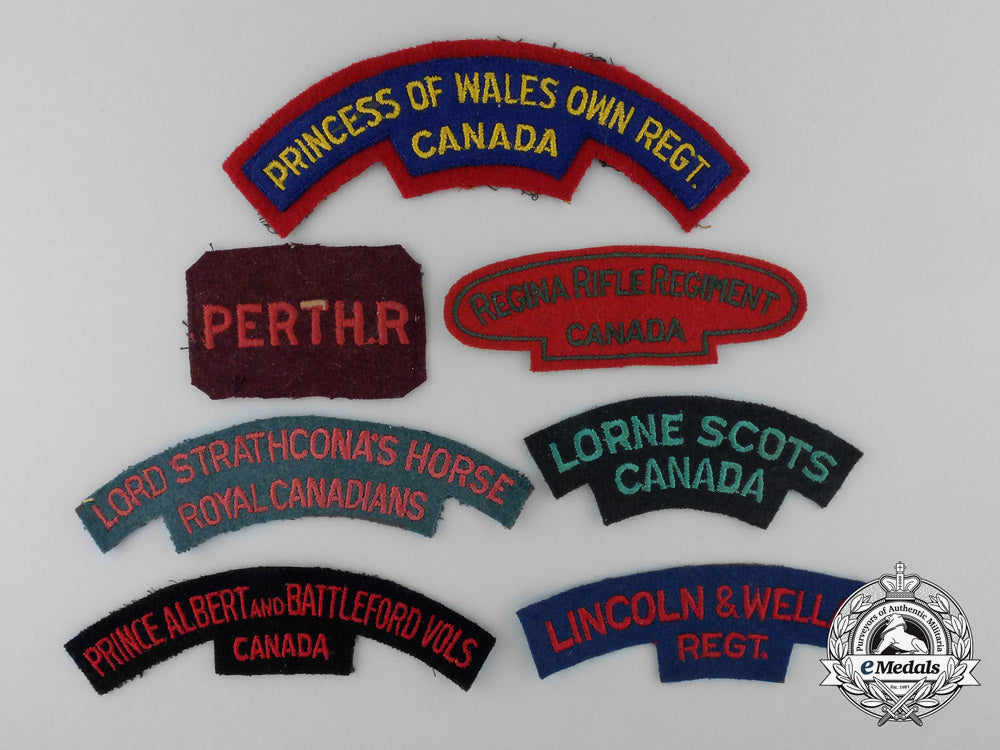 Lincoln & Welland Regiment (red embroidered lettering on blue felt, black cotton mesh backer, 34 mm x 125 mm); Lord Strathcona's Horse - Royal Canadians (salmon-coloured embroidered lettering on greenish-blue felt, black cotton mesh backer, 30 mm x 137 mm); Lorne Scots (green embroidered lettering on black felt, white cotton mesh backer, 33 mm x 101 mm); Perth Regiment (red embroidered lettering on maroon felt, black cotton mesh backer, 45 mm x 71 mm, embroidery flaw on the "T"); Prince Albert and Battleford Volunteers (red embroidered lettering on black felt, black mesh cotton backer, 32 mm x 128 mm); Princess of Wales Own Regiment (yellow embroidered lettering on red felt, black cotton mesh backer, 42 mm x 157 mm); and Regina Rifle Regiment (green embroidered lettering and border on red felt, khaki cotton mesh backer, 36 mm x 108 mm, paper residue on the reverse from previous board mounting). Ranging from very fine to extremely fine.