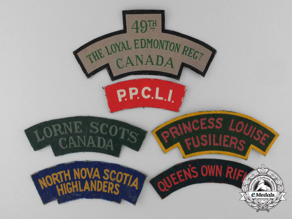 Lorne Scots (forest green screen-printed background on a light green screen-printed white canvas, highlighting the lettering, black backer, 33 mm x 115 mm); 49th Loyal Edmonton Regiment (green lettering and black border screen-printed on khaki canvas, black backer, 60 mm x 137 mm); North Nova Scotia Highlanders (yellow lettering with a blue background screen-printed on white canvas, black backer, 35 mm x 118 mm, paint residue on the reverse from previous board mounting); Princess Louise Fusiliers (red lettering and yellow border screen-printed on dark green canvas, black backer, 41 mm x 120 mm); Princess Patricia's Canadian Light Infantry (red screen-printed background on a white screen-printed canvas, highlighting the lettering, black backer, 27 mm x 75 mm); and Queen's Own Rifles (red screen-printed lettering on forest green canvas, black backer, 21 mm x 112 mm). Ranging from very fine to extremely fine.