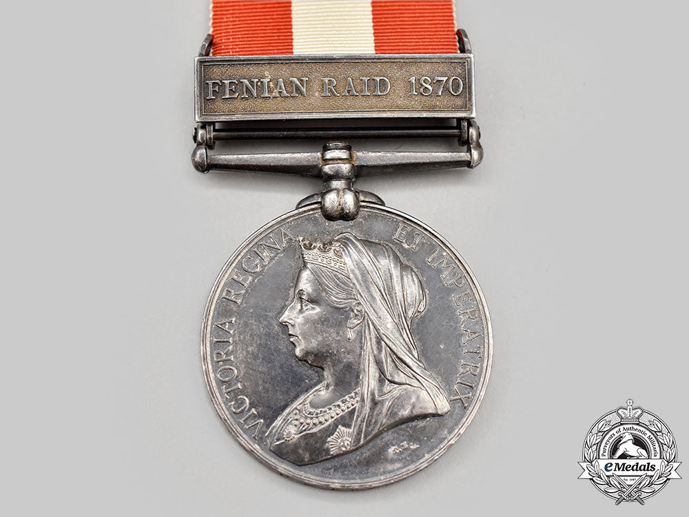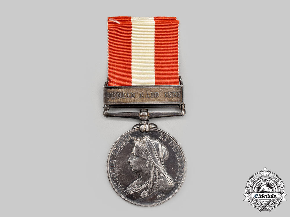Instituted in 1899. 1 Clasp - FENIAN RAID 1870 (Pte. H.W. Perry. 60th. Bn.). In silver, engraver marked "T.B." on the obverse, measuring 36.3 mm in diameter. Naming is officially impressed. Dark patina, edge nicks, very light contact overall, shortened replacement ribbon, near extremely fine.