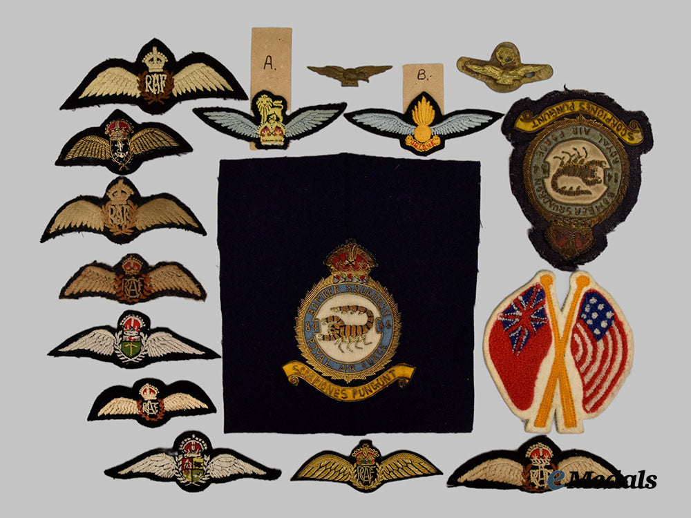 Includes: 1. United Kingdom: nine Royal Air Force Badges: (a) two Royal Air Force Pilot Wings, (b) two Army Air Corps Wings, (c) Fleet Air Arm Wings, (d) two bronze Eagle Cap Badges (one with a support plate and Crown), (e) two 84 Bomber Squadron Jacket Patches (both with a manufacturer's label affixed to the reverse inscribed "British Embroidery Works Elphinestone street Karachi"); 2. Canada: four Royal Canadian Air Force Pilot Wings; 3. Rhodesia: Rhodesian Air Force Pilot Wings; 4. South Africa: South African Air Force Pilot Wings; 5. United States: Crossed Canadian Red Ensign and American Flags Jacket Patch. All but the two bronze Eagles are embroidered in various colours of threading, four incorporating bullion wire, a few are padded, in a variety of sizes, ranging from fine to near extremely fine.
