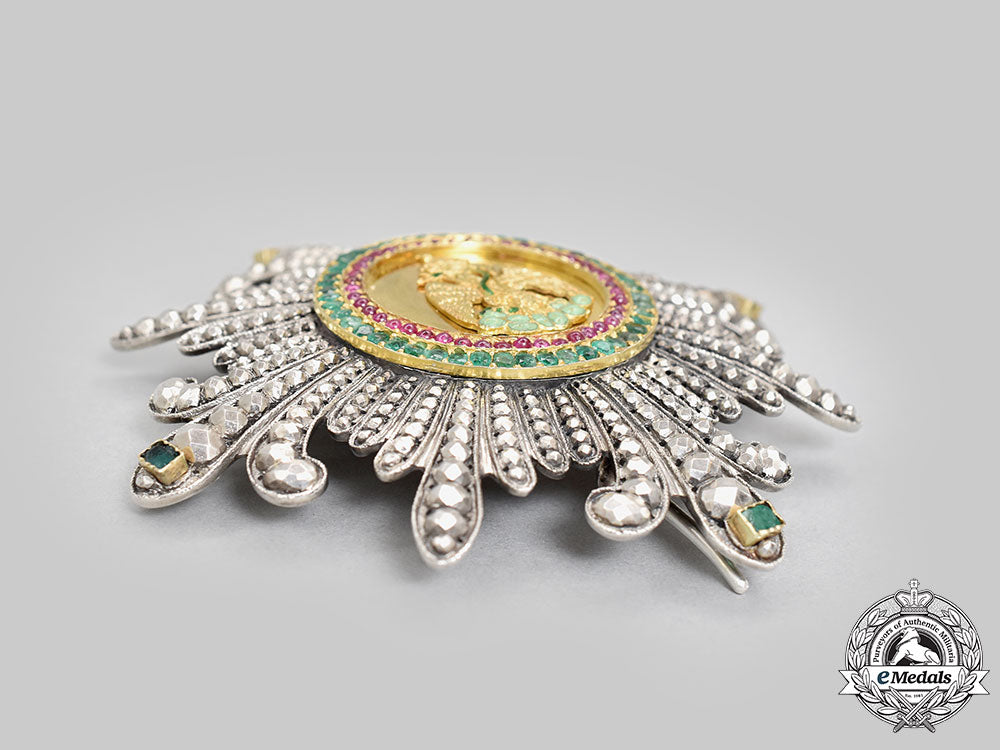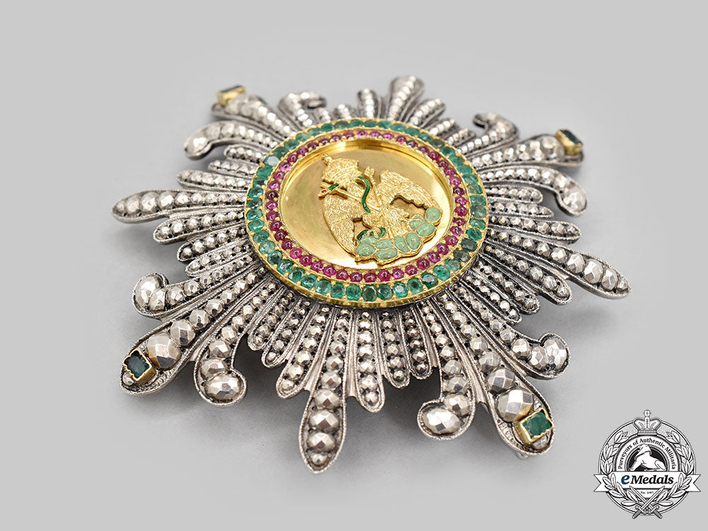 Accompanied by the breast star of the order, in silver with four principle faceted arms with a fleur-de-lys design, with a large cushion cut emerald set at each arm tip, clusters of seven faceted rays in each quadrant, the obverse medallion features a Gold Mexican Imperial Eagle clutching a light green enamelled branch in its talons with a green enamelled snake across its body and held in its beak at the center, surrounded in a ring of 44 round rubies and an exterior ring of 47 emeralds, the reverse features a single pin assembly, measures 92.5mm (w) x 92mm (h), weighs 79.6 grams, hinge and catch functional, light chips and inclusions to rubies and emeralds on medallion, emeralds on tips of principle arms show damage, lovely patina, a rare star in extremely fine condition.
