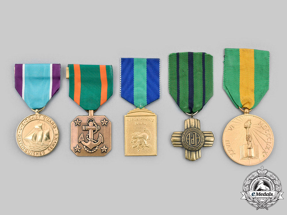 4. Coast Guard Distinguished Service Medal (in fire gilt bronze, measuring 33.7 mm in diameter, original ribbon with brooch pinback);