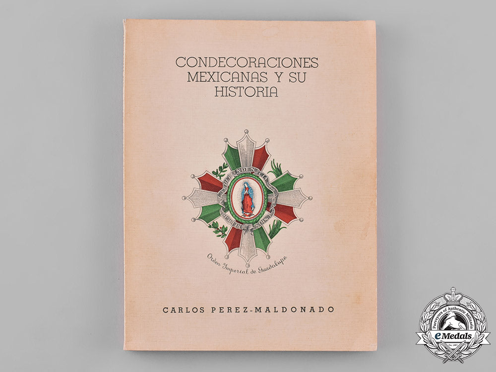 (Condecoraciones mexicanas y su historia). Condecoraciones mexicanas y su historia (Mexican Decorations and its History), by Carlos Perez-Maldonado, constructed of paperback binding, containing 212 pages with black-and-white illustrations, measuring 17.4 cm (w) x 23.3 cm (h), mild soiling on cover, scuffing along edges, and in very fine condition.