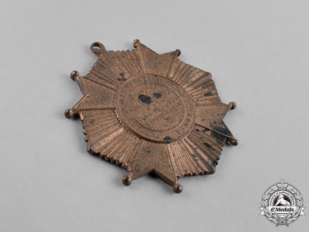 Cruz por la intervencion Francesa. Instituted in 1867. In bronze gilt, measuring 44.7 mm (w) x 47.5 mm (h) inclusive of its integral ring, extensive spotting, light contact, near very fine.