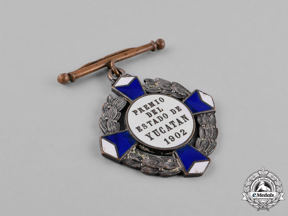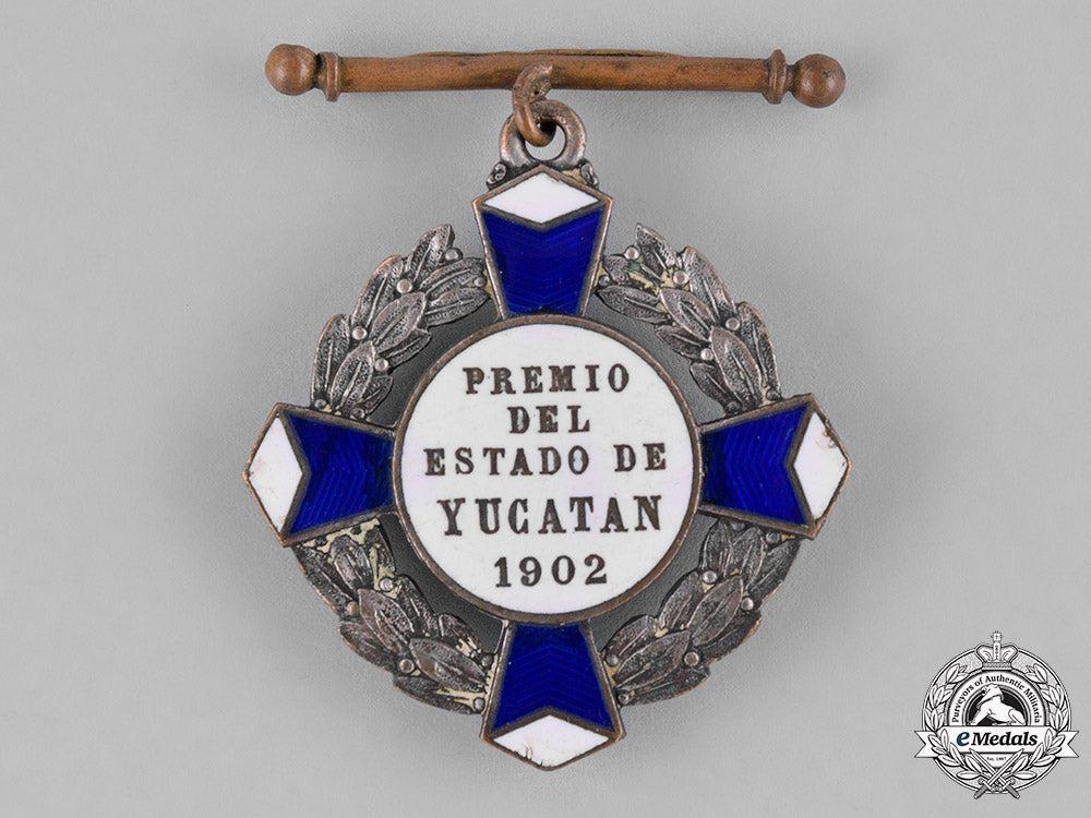 (La Cruz de Yucatán). Instituted 1902. 1902-1905 issue. An enameled white and blue four-armed cross in silvered bronze, with enameled white obverse centre depicting the inscription PREMIO DEL ESTADO DE YUCATAN 1902 (State of Yucatan Award 1902), reverse without enamels exhibiting the inscription CAMPAÑA CONTRA LOS MAYAS (Campaign Against Mayas) on the central medallion, surrounded by detailed laurel wreath in silvered bronze, measuring 42.67 mm (w) x 47.12 mm (h - inclusive of the integral ring), with period replacement bar suspension in bronze, toned silvered bronze, with minor crack of white enamels on the arms, fine.