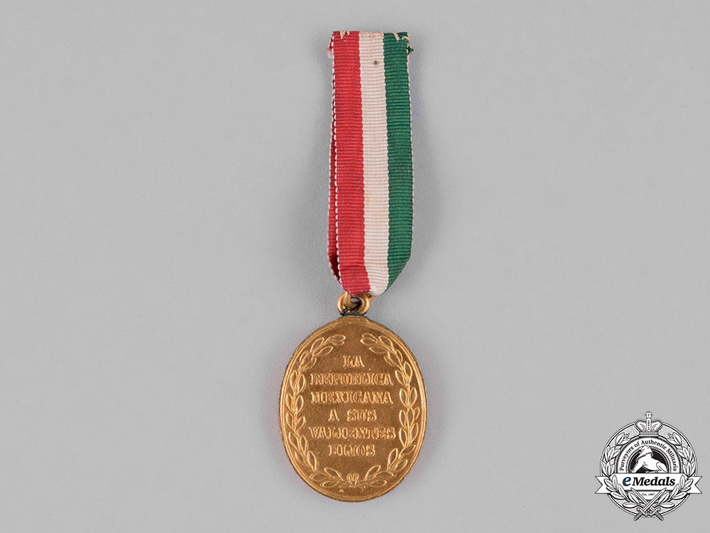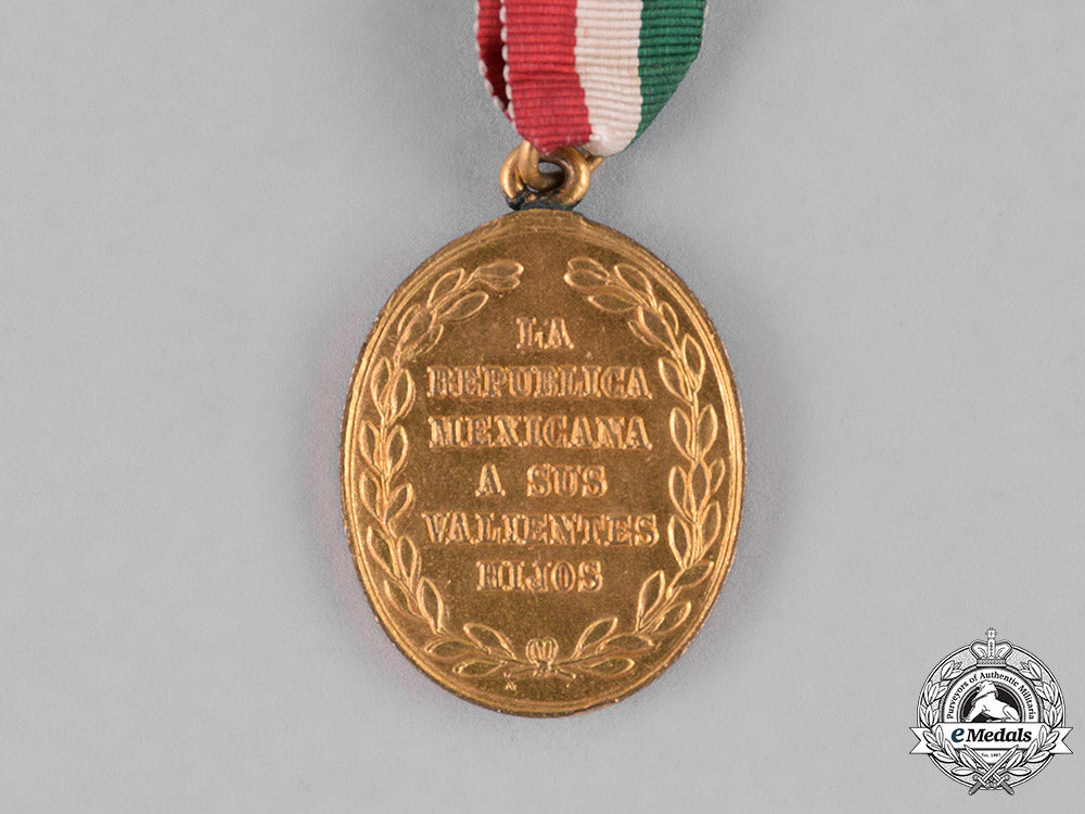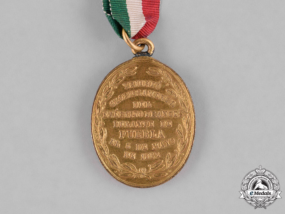 (Medalla por la Defensa de la Ciudad de Puebla). Instituted 1862. 1862 Issue. An oval silver gilt medal, obverse inscribed by LA REPÚBLICA MEXICANA A SUS VALIENTES HIJOS (The Mexican Republic to its Courage Sons) surrounded by a tied coffee wreath, reverse depicting the inscription TRIUNFO GLORIOSAMENTE DEL EJERCITO FRANCES DELANTE DE PUEBLA EL 5 DE MAYO DE 1862 (He Won with Glory against the French Army in Puebla on 5th of May of 1862) surrounded by a laurel wreath, measuring 21.52 mm (w) x 30.54 mm (h - inclusive of the integral ring), presenting minor wear in the edges, accompanied by original of time period ribbon, better than very good.