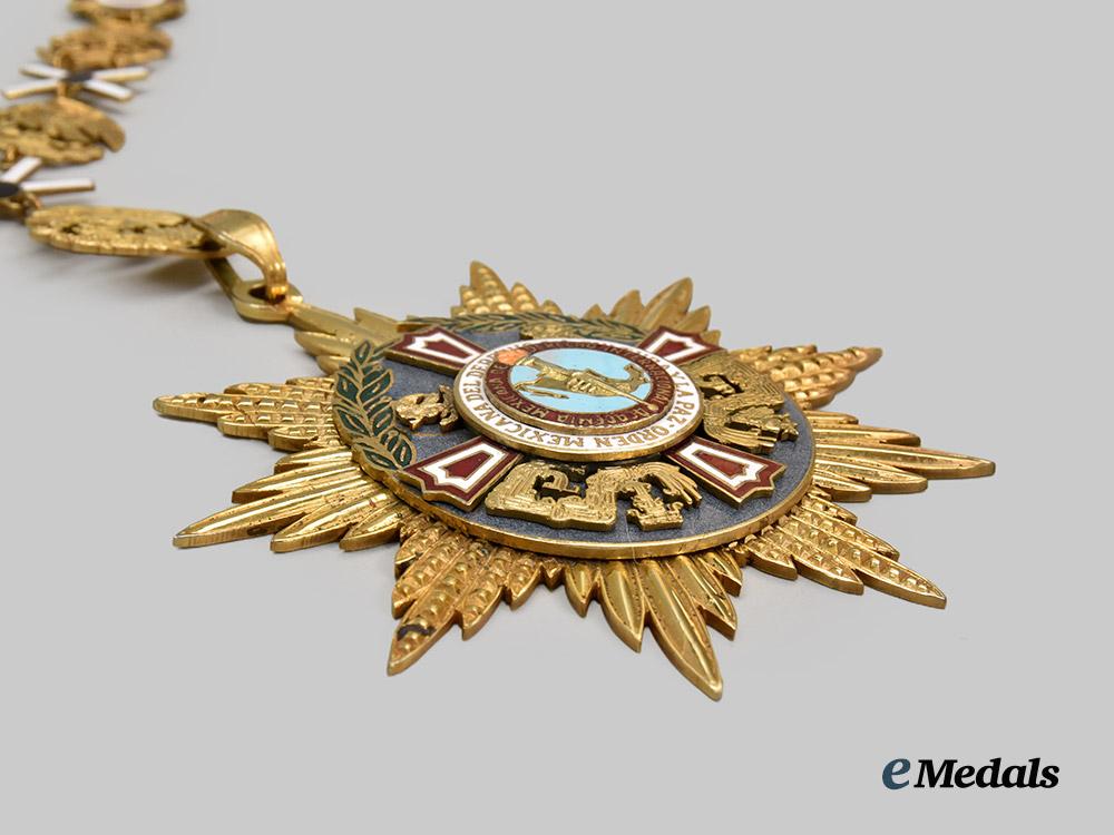 (Orden Mexicana del Derecho y la Paz). Instituted 1960. Consisting of a silver gilt collar, comprising 32 links alternating between the mexican eagle clutching a snake (totalling 15), a white enamelled X with a central black disc (totalling 5), and a red enamelled cross with rays in each quadrant and a white enamelled ring in the center (totalling 12), presenting a total of 32 links, all plain on the reverse, connected to the collar badge via a slightly larger eagle link, a large ten point star with alternating clusters of five smooth and five faceted rays, with a superimposed medallion featuring a hand within the shape of mexico holding a torch on a blue field, encircled by a red ring inscribed ACADEMIA MEXICANA DE DERECHO INTERNACIONAL, within another white ring inscribed ORDEN MEXICANA DEL DERECHO LA CULTURAL Y LA PAZ, red and white enamelled cross with an eagle and snake in the top two quadrants, the bottom two with Mexican symbols, all on a blue background with green laurels along the edge of the top half, the reverse is plain, measures 95.88mm (w) x 106.68 mm (h - inclusive of integral ring), totalling 640 mm (from the eye at the end of the collar to the base of the badge - one side), enamels intact, clasp functional, a rare decoration, in extremely fine condition.