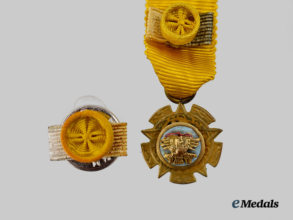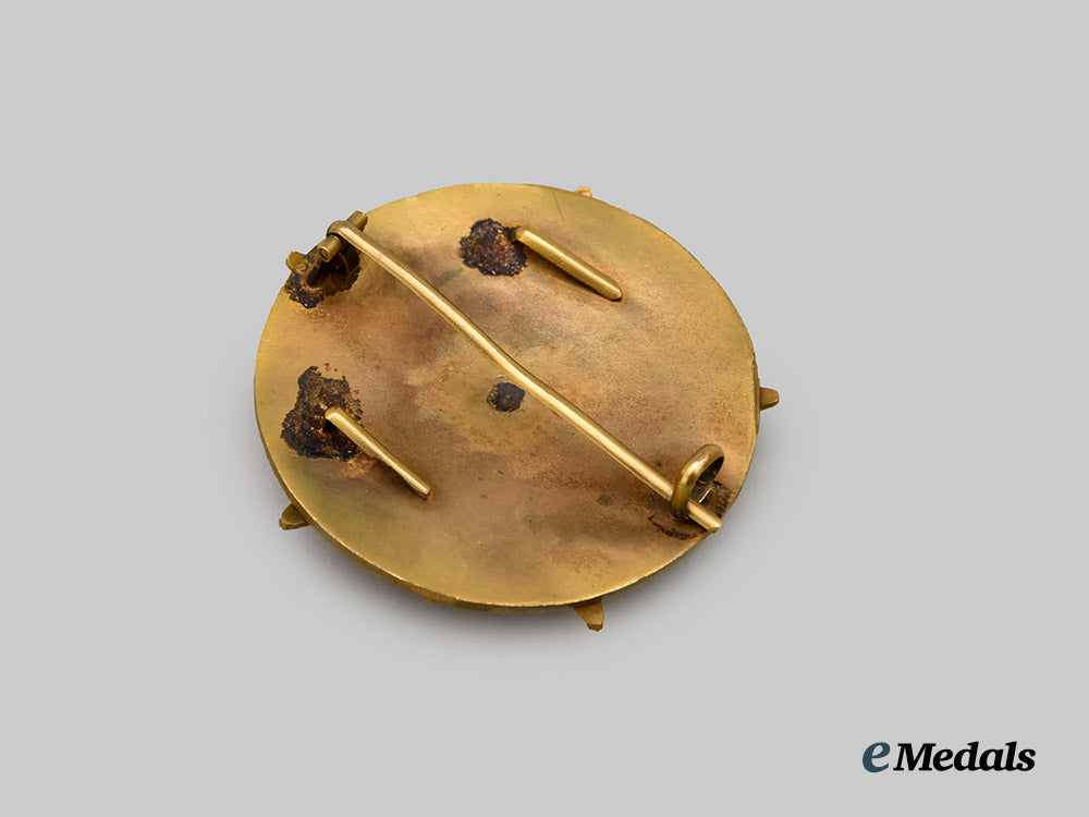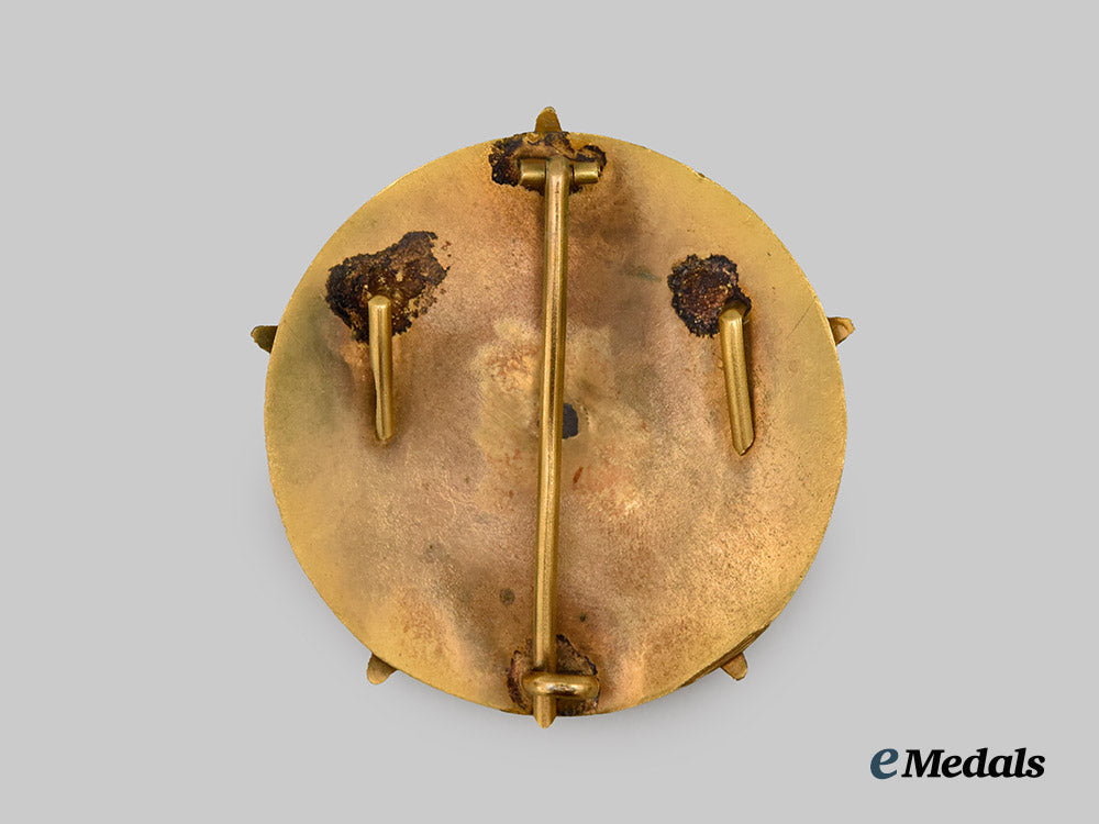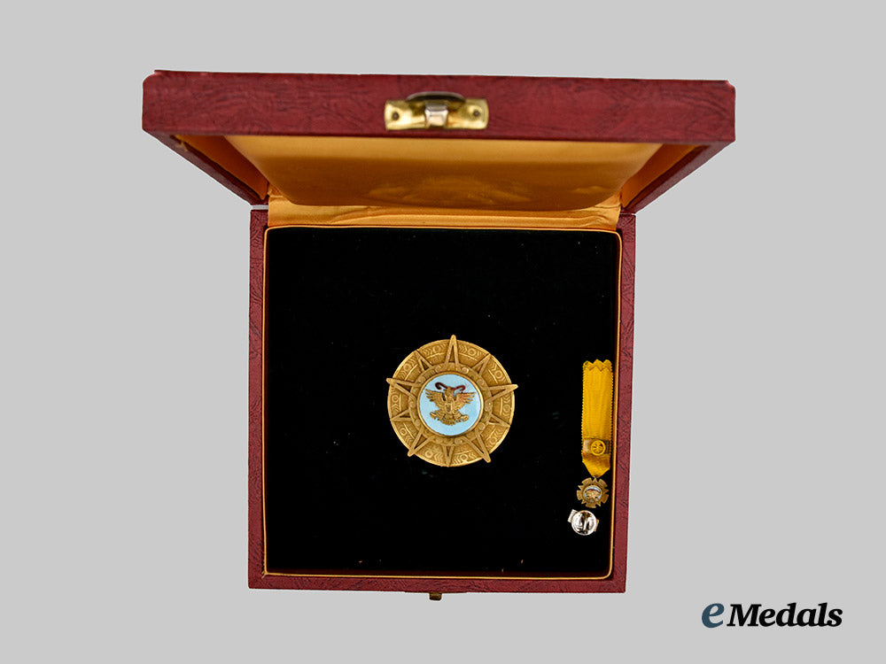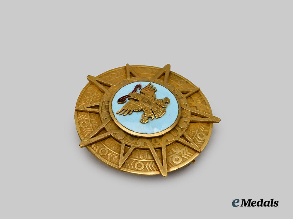 (Orden Mexicana del Águila Azteca). Instituted in 1933. In brass, the obverse center bearing a golden eagle holding a rattlesnake in its beak on a ceramic turquoise base at center, reverse pinback, 58.7 mm, some transfer of red color on ceramic base, extremely fine. Accompanied by a miniature of the breast star, extremely fine. In its original case, very fine.
