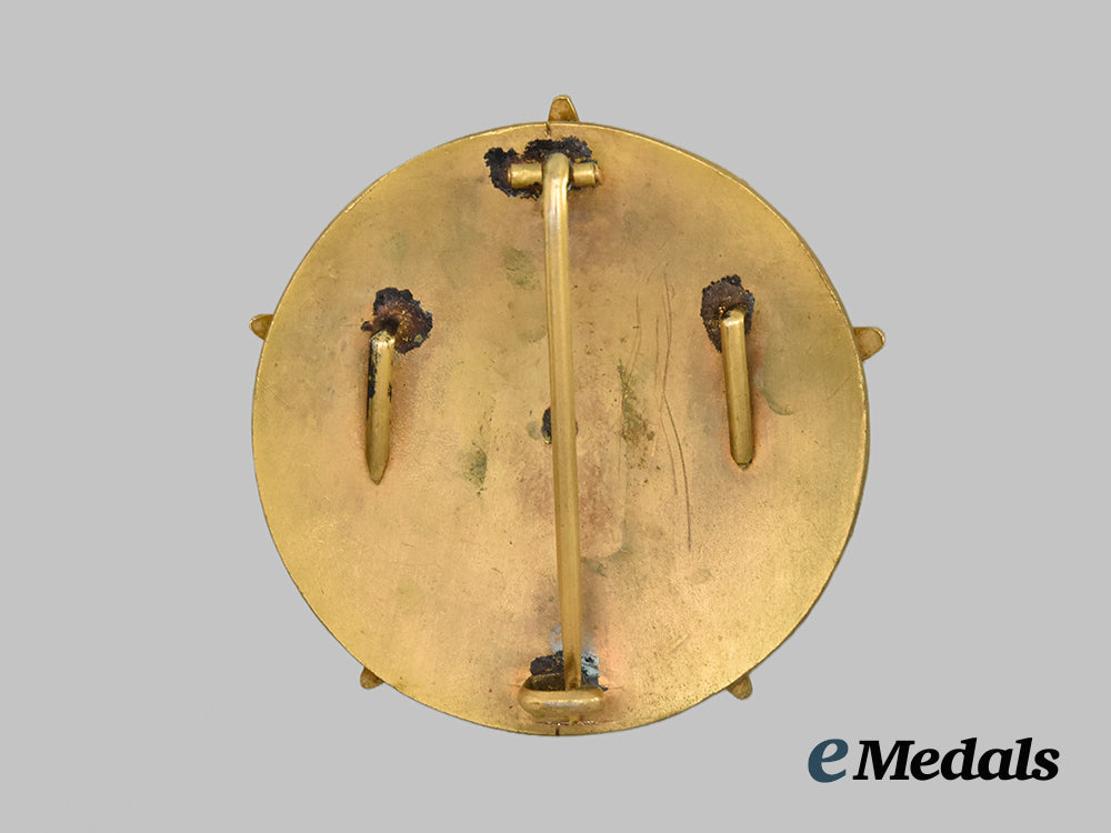 Instituted in 1933. In brass, obverse centre shows a golden eagle holding a rattlesnake on a blue-enameled background, reverse pinback, 58.7 mm, evidence of wear on blue enamel and oxidation on reverse, very fine condition.