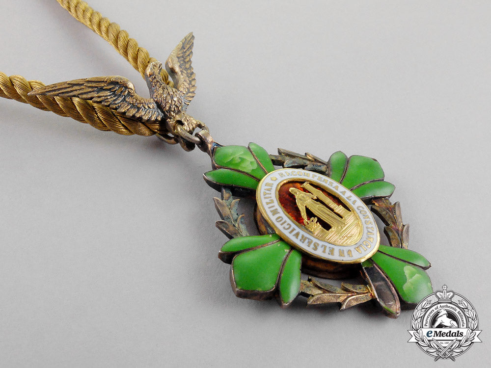 (Military Constancy Cross). Type I. Army Issue. Generals Issue. Of high quality manufacture, likely of French origin, in toned silver with four green enameled arms, interlaced by gilt laurels, obverse centre in Gold depicting the Lady of Guadalupe, reverse in white enamels on Gold, with distinctive spread eagle suspension in silver gilt with single integral ring for commander's neck cord, cord in gilt bullion wire denoting a General's rank issue, overall measuring 42.2 mm (w) x 77 mm (h - inclusive of eagle's wings), with enamel loss to reverse, otherwise extremely fine and rare.