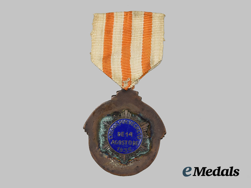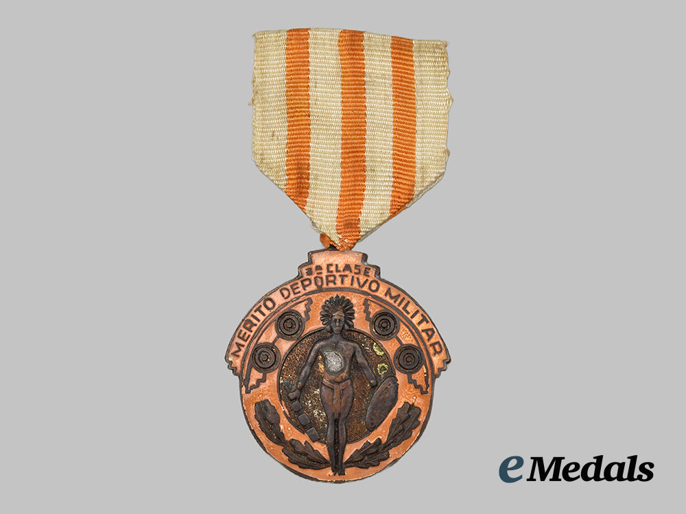 (Mérito Deportivo Militar). Two-piece construction, in copper with orange enamels on the obverse and blue enamels on the reverse, measuring 38.2 mm (w) x 43 mm (h) inclusive of its integral suspension, intact enamels, green oxidation evident along the outer edges of the insignia on the reverse, original ribbon, near extremely fine.
