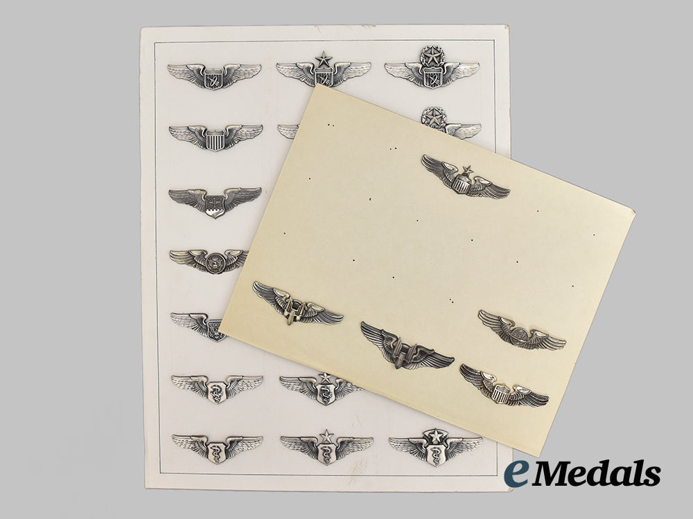 Includes: 1. Basic Pilot Badge with Astronaut Device; 2. Senior Pilot Badge with Astronaut Device; 3. Master Pilot Badge with Astronaut Device; 4. two Basic Pilot Badges (one vintage); 5. two Senior Pilot Badges (one vintage); 6. Master Pilot Badge; 7. Basic Combat System Officer/Navigator/Observer Badge; 8. Senior Combat System Officer/Navigator/Observer Badge; 9. Master Combat System Officer/Navigator/Observer Badge; 10. Basic Officer Aircrew Badge; 11. Senior Officer Aircrew Badge; 12. Master Officer Aircrew Badge; 13. Basic Enlisted Aircrew Badge; 14. Senior Enlisted Aircrew Badge; 15. Master Enlisted Aircrew Badge; 16. Basic Flight Surgeon Badge; 17. Senior Flight Surgeon Badge; 18. Chief Flight Surgeon Badge; 19. Basic Flight Nurse; 20. Senior Flight Nurse; 21. Chief Flight Nurse; 22. two Bombardier Badges (obsolete); 23. Navigator Badge (obsolete). Three are in sterling silver, twenty-one are 1/20 Silver Filled metal, two are in metal, many are maker marked, in various sizes, twenty-five with dual push pin attachments, the Navigator Badge with a horizontal pinback, ranging from very fine to extremely fine.