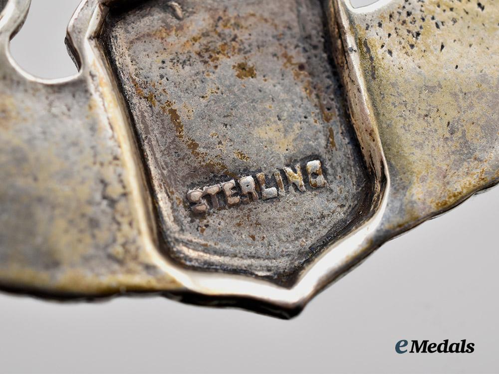 In sterling silver, a heavy wing with central S, reverse marked STERLING, horizontal pin, measures 73.9 mm (w) x 21.5 mm (h), light tarnishing, in very fine condition.