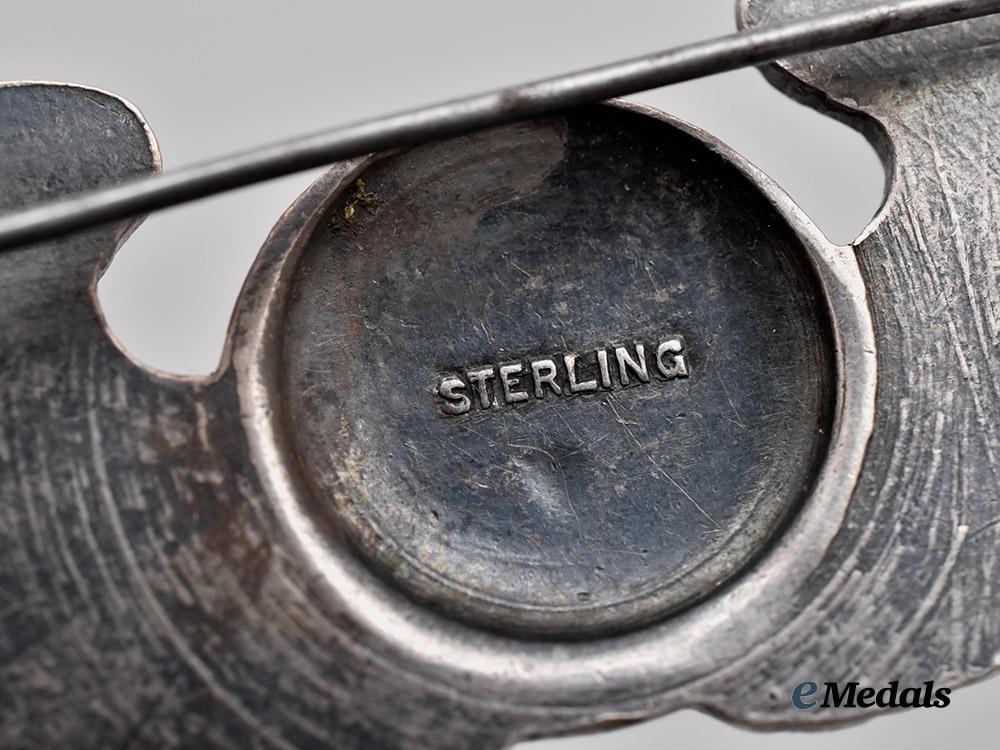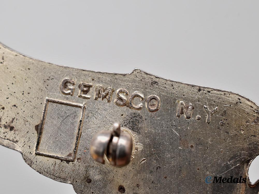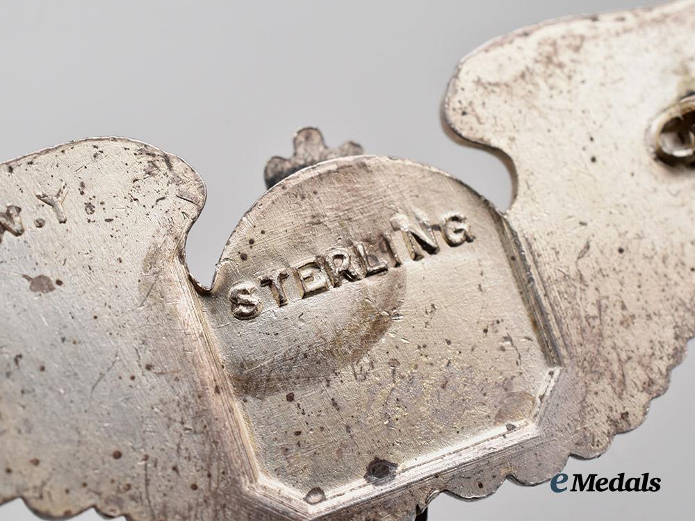 An Air Force Bombardier Badge, in silver, reverse marked GEMSCO N.Y. STERLING, horizontal swing pin, measures 78.9 mm (w) x 22.4 mm (h), light wear, in extremely fine condition.