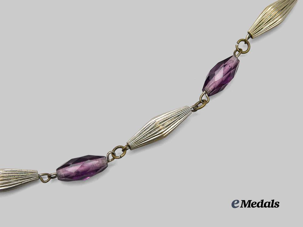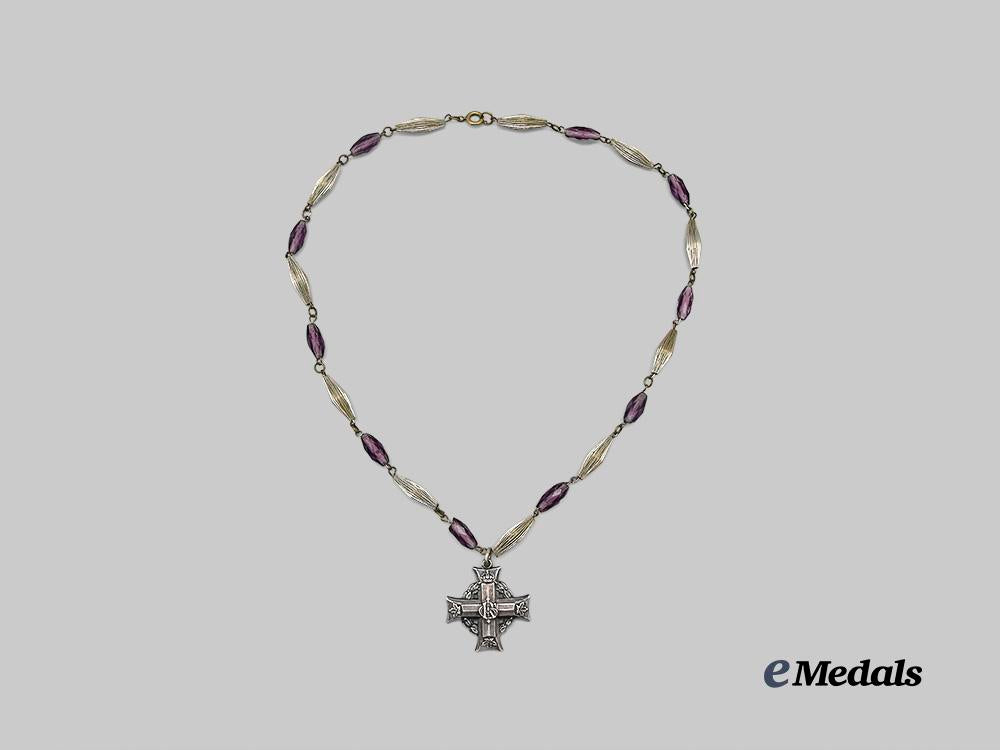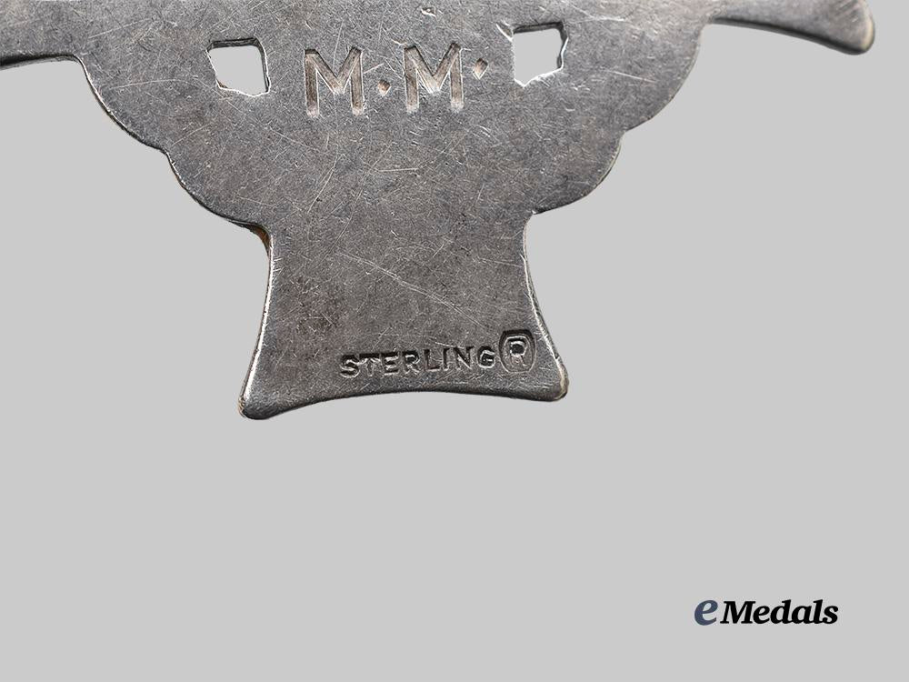 In silver, reverse engraved 47850 SGT. S.E. EFFINGER. M.M., marked STERLING on 6 o’clock arm, worn on a period constructed silver and purple beaded necklace, light wear, extremely fine.