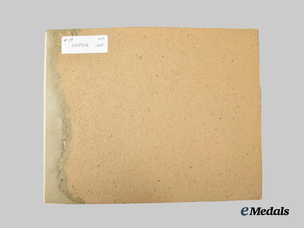 A watercolour on paper, featuring a soldier in uniform laying on his front, taking aim through his rifle over the edge of the trench, untitled, signed “Jukes 1918” along bottom right edge, contained between two pressed boards offering a surrounding matte frame, measures 310 mm (w) x 250 mm (h), light staining to sky and several creases present vertically, minor wear elsewhere, remains very fine.