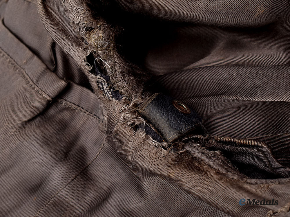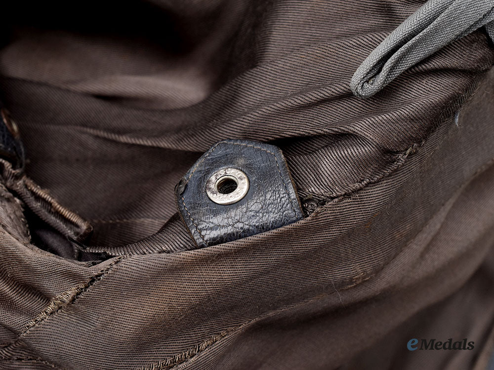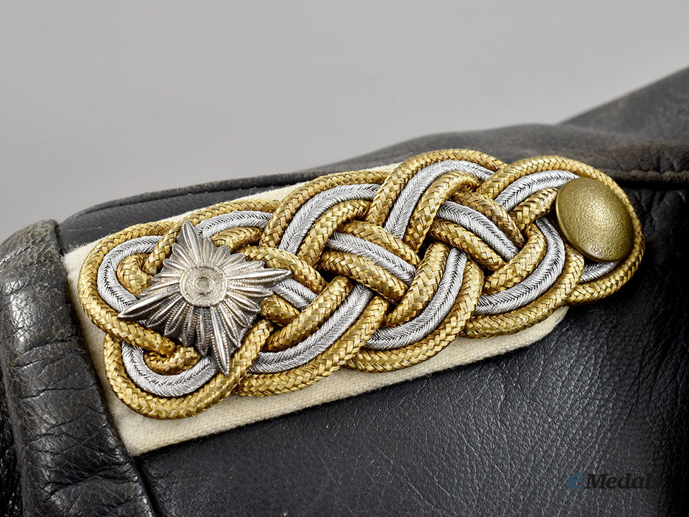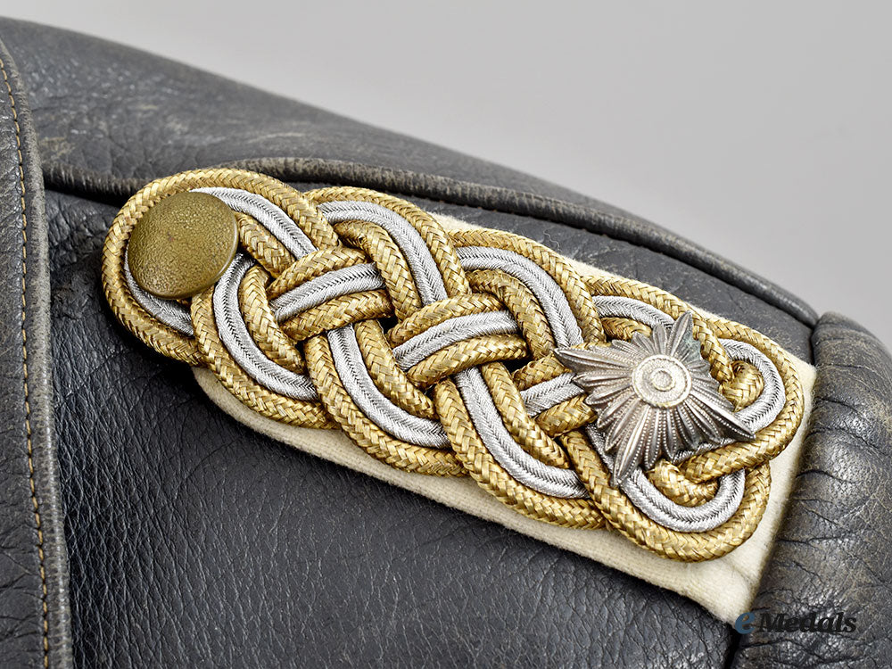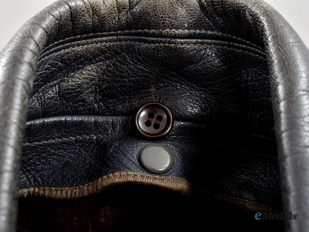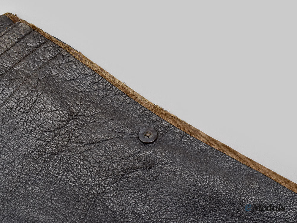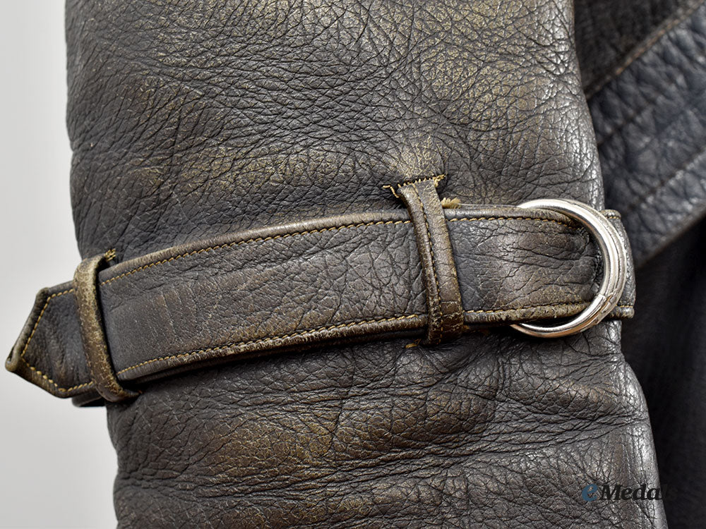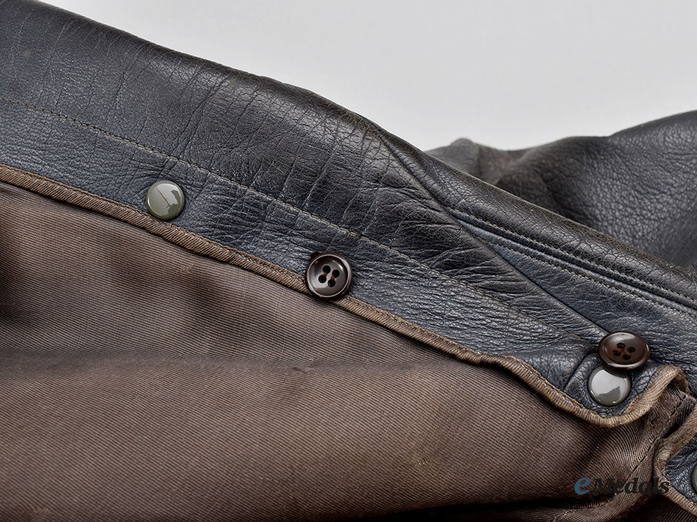 (Luftwaffe Generalleutnant Ledermantel). A well preserved Luftwaffe Generalleutnant greatcoat, constructed of multiple pieces of heavy grey leather with machine stitched reinforcements along the seams. It features a large turned-down collar that transitions into double breast flaps, with the reverse of the collar featuring the addition of a leather strap with snap-buttons to allow for closing of the collar during adverse weather conditions. The collar is flanked on either side with Luftwaffe Generalleutnant shoulder boards, sewn to the shoulder on one side and fastened to the coat via a nonmagnetic pebbled button, constructed of a cardstock core with a white wool exterior, topped by a single band of knotted silver aluminum wire piping, interwoven with two brands of gold bullion wire piping, and pinned with a single silvered pip, measuring 44 mm (w) x 100 mm (l). Hidden underneath the left breast flap is a 20 cm long zipper that allows access to a deep interior pocket. Each cuff features the addition of a leather strap with metal keepers to adjust the size of the cuff opening. At waist height on either side of the coat is a deep softly lined pocket secured by a flap without buttons, with the addition of two exterior belt loops for the accompanying belt. Each side of the coat opening features eight snap buttons, each marked “Stocko”, with the interior of the coat completely lined in grey rayon, including the sleeves. The interior also has one breast pocket per side, along with an additional pocket hidden on the bottom right flap of the coat. It measures approximately 43 cm across the shoulders (seam to seam), with a sleeve length of 66 cm, and an overall length of 133 cm. This overcoat is in worn condition, with fatigue in the leather throughout, some field repairs, in overall very fine condition.
