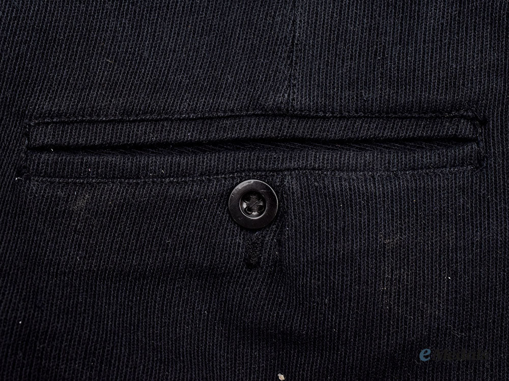 (Deutsche Arbeitsfront Werkschar Stiefelhose). A pair of fine quality German Labour Front Werkschar breeches, constructed of heavy black corduroy, with one vertical-slit pocket per side, along with one additional horizontal-slit pocket on the right side of the reverse. There is an additional pair of matching straps sewn to the inside of the rear beltline with one black bakelite button each, acting as optional fasteners for a pair of suspenders. Along the reverse is a matching black corduroy pull tab on either side with a metal keeper for optional adjustment. These breeches are secured shut in the front via a vertical slit with a total of five matching black bakelite buttons that are met by reinforced button-holes on the opposing side. The interior is unlined, except for the beltline and the interior of the pockets, which are lined with light grey cotton. The pant leg cuffs have a 25 cm long vertical slit that are secured shut via a metal zipper. This pair measures approximately 42 mm across the waist, with an inseam of 68 cm, and an overall length of 102 cm. This pair demonstrates light wear and material fatigue, without obvious signs of damage, in extremely fine condition.