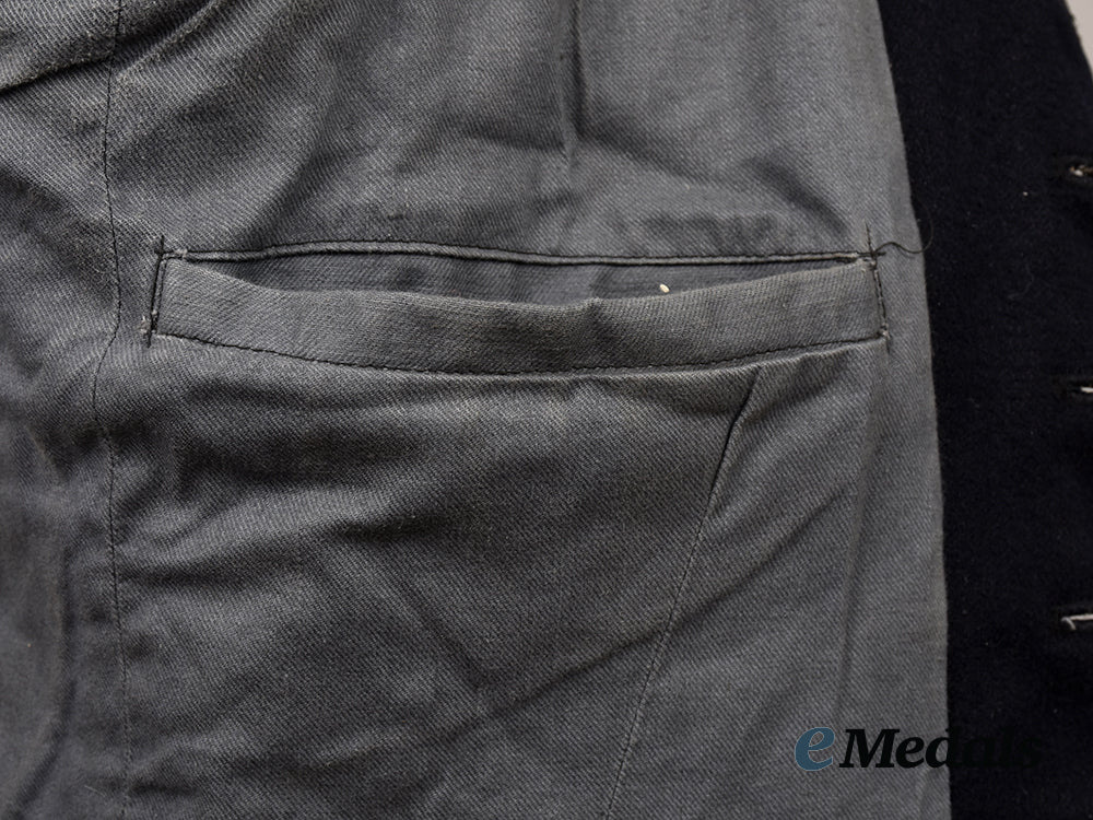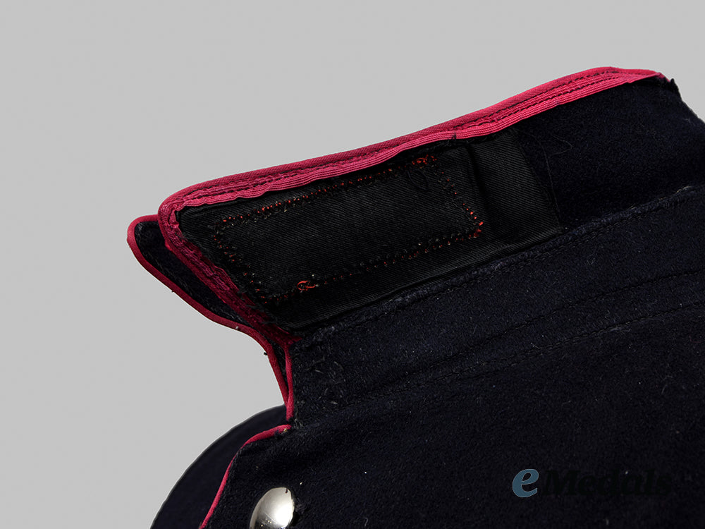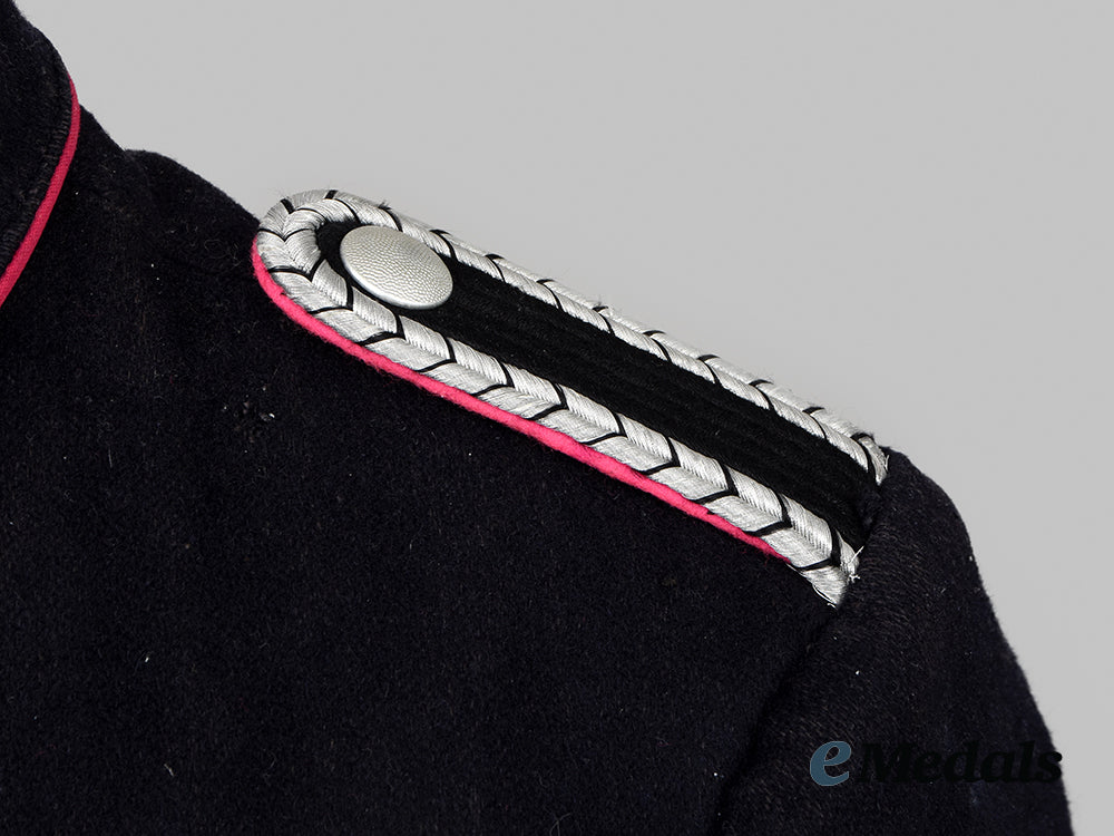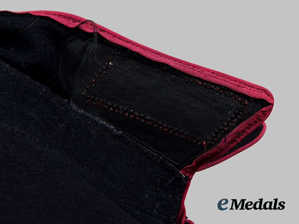 (Eine Feuerschutzpolizei Feuerwehrmann Dienstuniform). This is a well preserved service tunic belonging to a Feuerschutzpolizei Feuerwehrmann of Ober-Wöllstadt. It is constructed of thick, fine quality dark blue wool, with a standard down-turned collar that is flanked by collar tabs on both sides. The collar is lined on the outside edges with pink piping, while the tabs are constructed of a buckram core, with a bright cotton-rayon blend material and two strips of silver aluminum bullion tresse on the obverse, measuring 30 mm (w) x 65 mm (l). The shoulders are ordained with sew-on shoulder boards, constructed of a cardstock core, with a bright pink wool upper, decorated with two rows of silver aluminum bullion piping interspersed with black threading, with an additional two rows of black piping, all held in place via a single pebbled button. The tunic features a total of four pockets, two at breast height and two at waist height, all secured shut via a single polished magnetic metal button each. The left sleeve is ordained near the shoulders with a patch of the Feuerschutzpolizei of Ober-Wöllstadt, constructed of dark blue wool with bright pink machine embroidery reading “Ober-Wöllstadt” with a wreathed national eagle clutching a wreathed mobile swastika, all backed by a larger, diagonal, oak wreath, measuring 80 mm (w) x 105 mm (l). The tunic is secured shut in the front via eight vertically mounted matching polished magnetic buttons that are met by a matching number of reinforced buttonholes on the opposing side. Suspended from the second loophole of the tunic, is a ribbon for a War Merit Cross 1939 Second Class. Similarly to the collar, both sides of the frontal flap are lined with matching bright pink piping. The tunic is entirely lined with a grey coloured multi-piece cotton, except for the sleeves, which are lined with a blue lined cotton-rayon blend fabric. The tunic measures approximately 39 cm across the shoulders (seam to seam), with a sleeve length of 63 cm, and an overall body length of 81 cm. This is a well preserved example of a Feuerschutzpolizei tunic, depicting light to moderate signs of wear with material fatigue in the fabric, in overall near extremely fine condition.