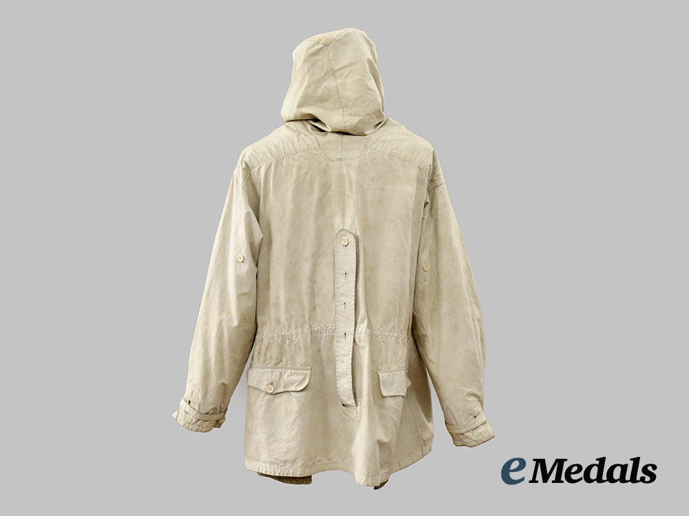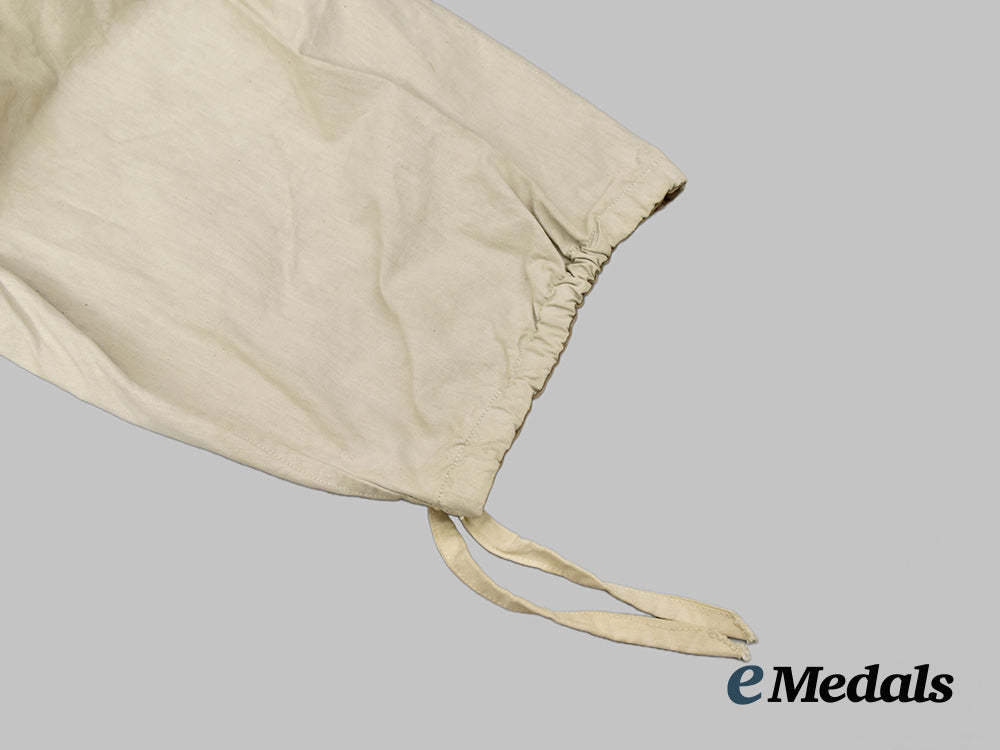(Ein zweiseitiger Wehrmacht Gebirgsjäger Anorak). A rare and extremely well preserved example of a Wehrmacht mountain troops smock and jumpers, constructed of a two-sided weather-hardened cotton-rayon blend. The one side is white, while the other is mouse-grey. At the neck of the tunic is a vertical slit with five pairs of eyelets, with a period-correct drawstring, and two wind flaps (one per side) that secures shut with three vertically mounted matching bakelite buttons on both sides. Each side of the smock has three pockets, oriented horizontally in a row at breast height across the chest. Every pocket, on both sides, is secured shut via scalloped flap and a single bakelite button. The hood has an integrated draw-string for tightening the hood during adverse weather conditions. At waist-height, on the winter side of the smock, is an internal channel with a period correct drawstring. Each cuff has a fabric strip at the end, acting as a drawstring, with a metal buckle for tightening the cuff. The reverse of the smock has two horizontal-slit pockets, one on either side, with a large drawstring to pull up the reverse of the tunic for easier access to the belt. It measures approximately 60 cm across the shoulders (seam to seam), with a sleeve length of 57 cm, and an overall length of approximately 80 cm. The jumpers are constructed of matching two-sided weather-hardened cotton-rayon blend, and are of simple construction, without pockets or a front opening. They are marked “Wilhelm Benger Söhne” and “2” on the mouse-grey side of the seam. At the waist is an integral belt that loops through an interior channel at the waist, coming out at the front, and weaving through a magnetic metal buckle. There is an integral set of drawstrings on the cuff of each leg, with a slit at the bottom to thread the string. They measure approximately 58 cm across the waist, with an inseam of 72 cm, and an overall length of 106 cm. The smock and jumpers are in worn condition, both sides showing light discolouration from age and wear, in overall extremely fine condition.