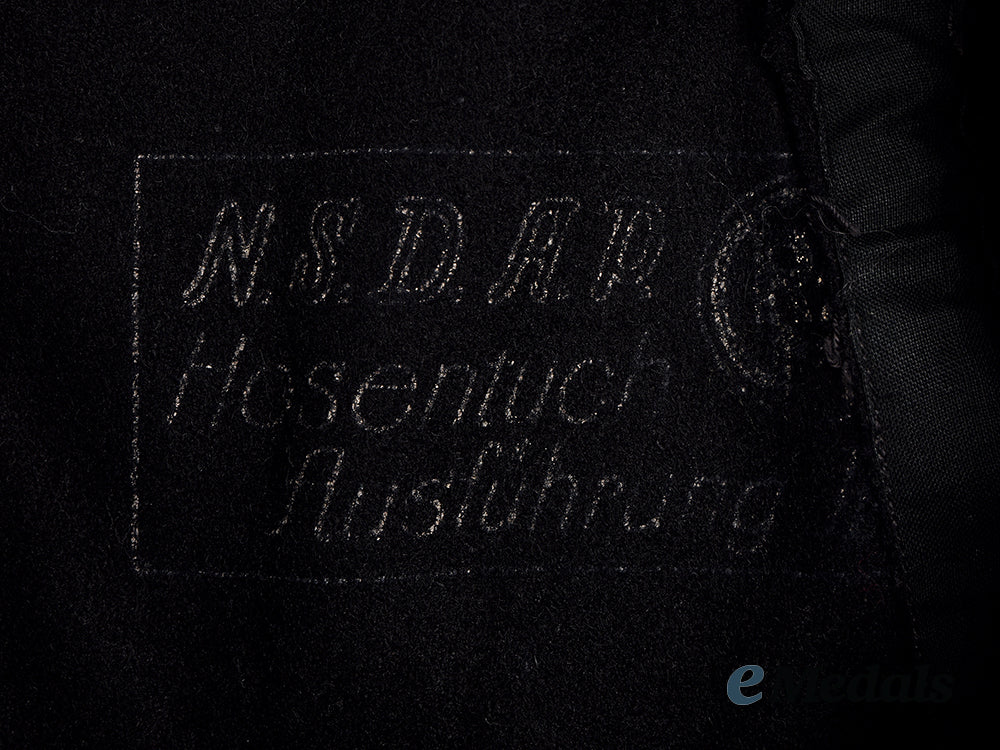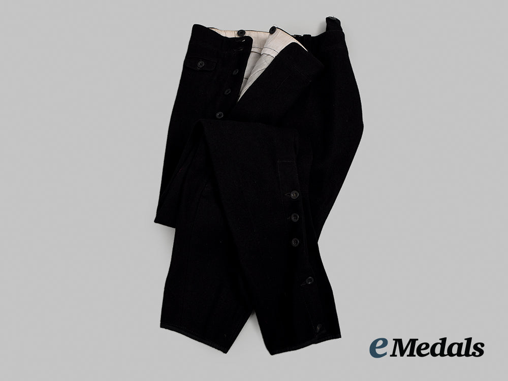 (Hitlerjugend/Deutsche Jungvolk Leiter Stiefelhose). A pair of extremely well preserved and possibly unworn pair of Hitlerjugend/Deutsche Jungvolk leader’s breeches, constructed of fine quality black wool, with one diagonal-slit pocket at waist-height per side that is secured shut via a scalloped flap and a single black bakelite button, marked “HJ” and “DJ” with two oak twigs in a “V” formation on the obverse. There is a horizontal-slit pocket on the right side of the reverse with an additional horizontal-slit pocket on the front to the left of the right-hand pocket, that are equally secured shut via a scalloped flap and matching black bakelite button. The front is secured shut via six matching and similarly marked black bakelite buttons that are met by hidden reinforced buttonholes on the opposing side. Along both sides at the hip is an integrated belt with a blued magnetic metal buckle per side for on-the-fly size adjustment. The inside is unlined with the exception of the beltline, the crotch and the interior of the pockets, which are lined with a silvery-grey rayon liner. There are an additional four matching buttons on the inside of the waist, with two fabric straps with buttons at the ends for the optional attachment of suspenders. Along the cuff of each pant leg is a 30 cm long vertical slit with five matching bakelite buttons, that are met by an equal number of reinforced button-holes on the opposing side. This pair of breeches measures 40 cm across the waist (seam to seam), with an inseam of 66 cm, and an overall length of 101 cm. This pair of breeches is free from signs of wear, in overall near mint condition.