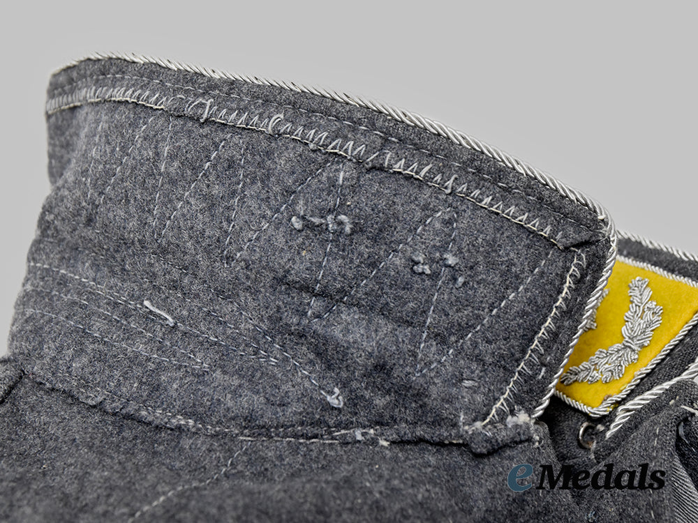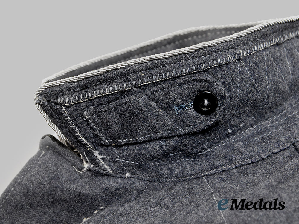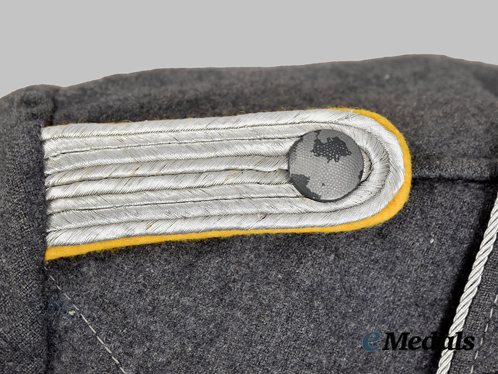 (Luftwaffe Leutnant Feldbluse mit Fallschirmjägerabzeichen). This tunic is constructed of dark grey wool, featuring a turned-down collar flanked by a matching set of Luftwaffe Lieutenant collar tabs, constructed of a buckram core, the exterior constructed of bright yellow wool, the obverse bearing a single gull, constructed of rolled silver aluminum bullion chord, adorned with laurel leaves beneath, equally manufactured of twisted and rolled silver aluminum bullion chord, with a twisted rolled silver aluminum bullion chord around the edges, measuring 45 mm (w) x 58 mm (l). The collar is unlined, with the edges adorned by a twisted aluminum bullion chord. Secured to the shoulders via a magnetic pebbled button is a set of sewn-on shoulder boards constructed of yellow wool with a cardstock core, bearing four rows of silver aluminum piping, measuring 35 mm (w) x 88 mm (l). The left breast is adorned with the cloth version of a paratrooper badge (Fallschirmjägerabzeichen - Stoffausführung), constructed of grey wool, the obverse bearing a machine-embroidered silver-grey laurel and oak leaf wreath, joined together at the bottom by a ribbon, overlaid by a golden-yellow diving Luftwaffe eagle clutching a mobile swastika, measuring 48 mm (w) x 65 mm (l). On the right breast is a Luftwaffe Officer’s breast eagle, consisting of an eagle clutching a mobile swastika, mounted on grey wool and constructed of rolled and twisted silver aluminum bullion chord, measuring 90 mm (w) x 45 mm (l). Positioned at the waist is one pleated pocket per side, both closing with flaps and secured via a single pebbled magnetic button. The two sides of the tunic are secured together using four glossy bakelite buttons that are met by reinforced button-holes on the opposing flap. The interior is partially lined with grey-coloured cotton fabric, featuring one internal pocket per side, the left pocket stamped “U.G.W Köln, 48, 45, 96, 66, 64” and dated “(19)41” in partially faded black ink. The interior also features belt straps suspended from the interior of either sleeve. It measures approximately 40 cm (from seam to seam), with a sleeve length of 63 cm (seam to cuff), and an overall length of 67 cm. The tunic exhibits period correct wear with light soiling, material fatigue, and some light mothing on the cloth paratrooper badge, in overall near very fine condition.