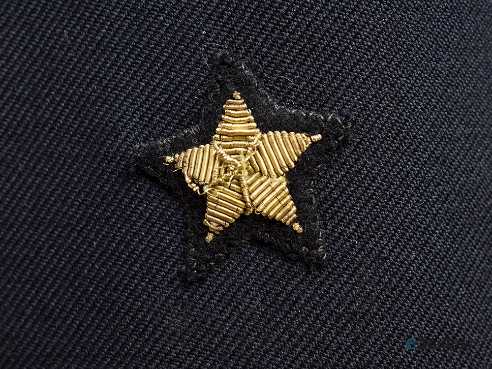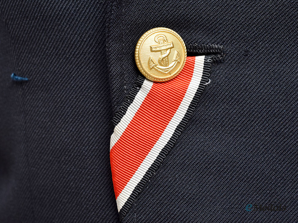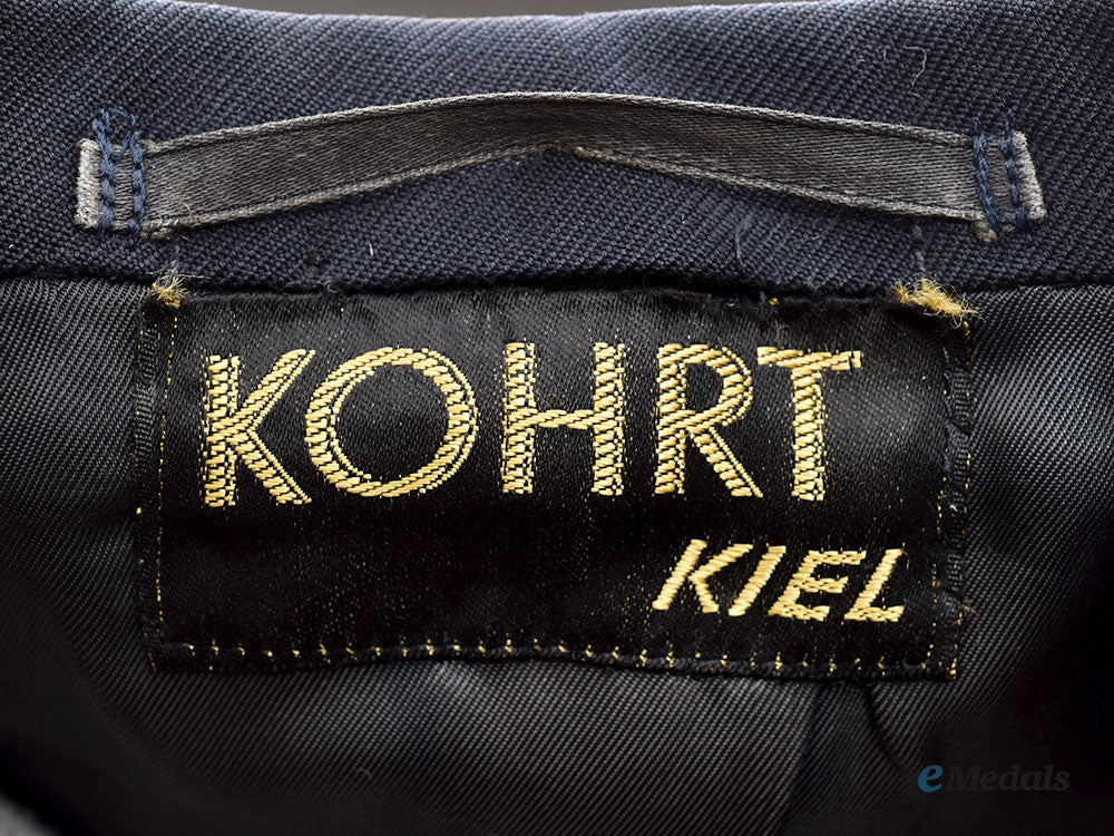 (Kriegsmarine Uniformrock für einen Vizeadmiral). A well preserved example of a Kriegsmarine Vice Admiral’s service uniform tunic, constructed of a dark navy blue whipcord wool blend, featuring a turned-down collar that transitions into double breasted lapels. The cuff of each sleeve is adorned with three tresses, all constructed of gold-coloured bullion wires, consisting of one broad tresse and two thinner tresses directly above, denoting the rank of Vice Admiral, along with a five-pointed gold bullion wire star on a wool backer, that is sewn onto each sleeve above the tresses. Stitched to the right breast of the tunic is a Kriegsmarine eagle, constructed of machine embroidered gold-coloured bullion wire, clutching a wreathed mobile swastika and mounted onto a matching dark navy blue wool backer, measuring 103 mm (w) x 47 mm (l). A narrow diagonal pocket is set into the upper left breast and is overlaid by threaded loops for the accomodation of a medal ribbon bar, while more loops beneath the pocket to accommodate decorations with vertical pinback. Five fire-gilded bronze buttons are stitched onto each side of the tunic, all bearing raised fouled anchors on the obverse, and marked “Kriegsmarine 1938” on the reverse. Each button is met by a reinforced buttonhole on the opposite side for secure closure, with the top buttonhole featuring a red, white, and black striped ribbon for the Iron Cross 1939 Second Class. The interior of the tunic is fully lined with black rayon liner, transitioning into off-white through the arms, with one interior pocket set into each breast. The collar features a label that is stitched to the tunic directly below the coat hook, reading “Kohrt Kiel”. It measures approximately 46 cm across the shoulders (seam to seam), with an arm length of 59 cm (seam to cuff), and an overall body length of 81 cm. This tunic shows light sporadic mothing in addition to very minor material fatigue consistent with age and field wear, remaining in extremely fine condition.