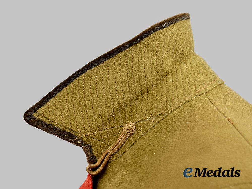 (Altábornagy Nagykabát). An example of a rare and overall well preserved greatcoat belonging to a Lieutenant General “Altábornagy” of the Hungarian regency. It is constructed of fine quality dark khaki-coloured wool, with the traditional turned-down collar lined on the obverse with brown doeskin and bearing two collar tabs, one per side. The collar tabs are constructed of red wool, the left tab bearing a laurel twig while the right bears an oak twig, both constructed of twisted and rolled gilt bullion wires, and with a decorative gilt button near the top bearing the Hungarian crown, measuring 45 mm (w) x 120 mm (l). Both cuffs feature red piping near the bottom third where the cuff starts, while the right cuff decorated with two narrow and one broad strip of khaki-coloured tresse, with an additional wool patch directly above, featuring two laurel twigs that are tied together at the bottom, with a Hungarian crown in the center, the combination of which denotes the rank of Lieutenant General (Altábornagy). This greatcoat features standard dual lapels, both lined with bright red wool, with the addition of an embroidered bead and loop at the neck of the collar for closing of the tunic during adverse wind and weather conditions. Both sides of this greatcoat are adorned with five gilt buttons each, positioned in a vertical manner, and are met with reinforced buttonholes on the opposing sides. All buttons are constructed of gilt bronze with a magnetic core, and adorned on the obverse with the Hungarian crown, measuring 25 mm in diameter, and marked “Qualität” (Quality) in German. At waist-height, in the front, is a single pocket per side, secured shut via a scalloped flap. The pockets are lined on the interior, featuring a horizontal slit within them in order to be accessed via both sides of this greatcoat. At waist height but on the reverse are two decorative flaps that are lined with red piping along the edges, with a faux belt and the addition of two matching gilt buttons. It is otherwise unlined, except for the decorative strip of lining near the bottom, constructed of red diamond-quilted rayon. This Hungarian greatcoat measures 45 cm across the shoulders (seam to seam), with a sleeve length of 63 cm, and an overall body length of 126 cm. The exterior of this greatcoat is well preserved, with only minor material fatigue, but with the inside liners partially separated from the greatcoat and held in place via field repair and modern safety pins, in overall better than very fine condition.