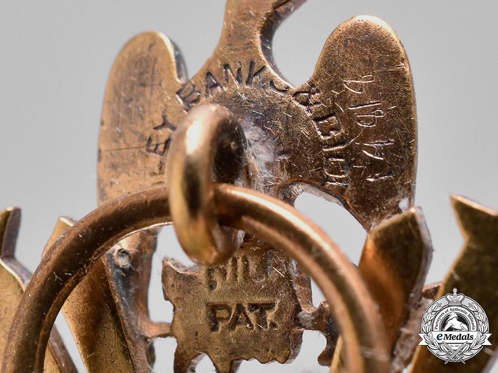 In 14K Gold with light blue and white enamels, weighing 15.9 grams inclusive of its ribbon and pinback, maker marked "BAILEY BANKS & BIDDLE PHILA", marked "PAT." (Patent) and hand engraved "14818" on the reverse of the eagle, engraved in running script "Abby L. R. Fyfe. No. 22 1896." on the reverse cartouche, measuring 30.5 mm (w) x 37 mm (h), intact enamels, frayed original ribbon suspended from pinback hanger in the shape of a ribbon banner, the hanger inscribed "MASSACHUSETTS, extremely fine. In its hardshelled case of issue, maker marked "The BAILEY, BANKS & BIDDLE COMPANY PHILADELPHIA", white satin medal bed, scuffing evident on the exterior, case very fine.