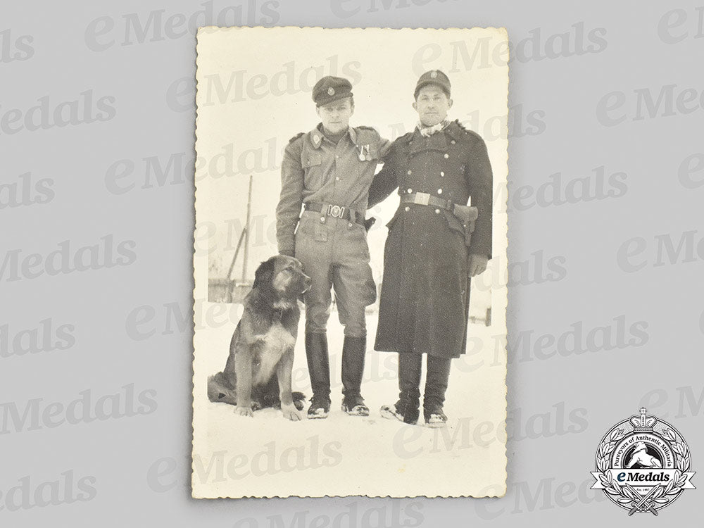 (Kolajna Ante Pavelić za junaštvo). Instituted in 1941. In silver, measuring 35 mm in diameter, edge nicks, light contact overall, on its original lightly soiled triangular ribbon with hook and eye, very fine. Accompanied by a Photograph of two Soldiers and a Dog, with the Soldier at the left Wearing the Medal (in black and white, inscription in blue ink on the reverse, with scalloped edges, measuring 85 mm (w) x 125 mm (h), extremely fine).