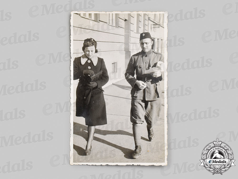 (Red za zasluge). Instituted in 1942. Three-piece construction, in silver with red enamels, measuring 25.3 mm (w) x 35 mm (h) inclusive of its integral suspension, intact enamels, obverse with green oxidation evident around the centrepiece and light wear on the "U", on its original bow-tied ribbon, near extremely fine. Accompanied by a Photograph of a Woman walking beside a Moslem Soldier (in black and white, semi-gloss finish, postcard style backer, numbered "13232" in pencil on the reverse, with scalloped edges, measuring 85 mm (w) x 135 mm (h), extremely fine).