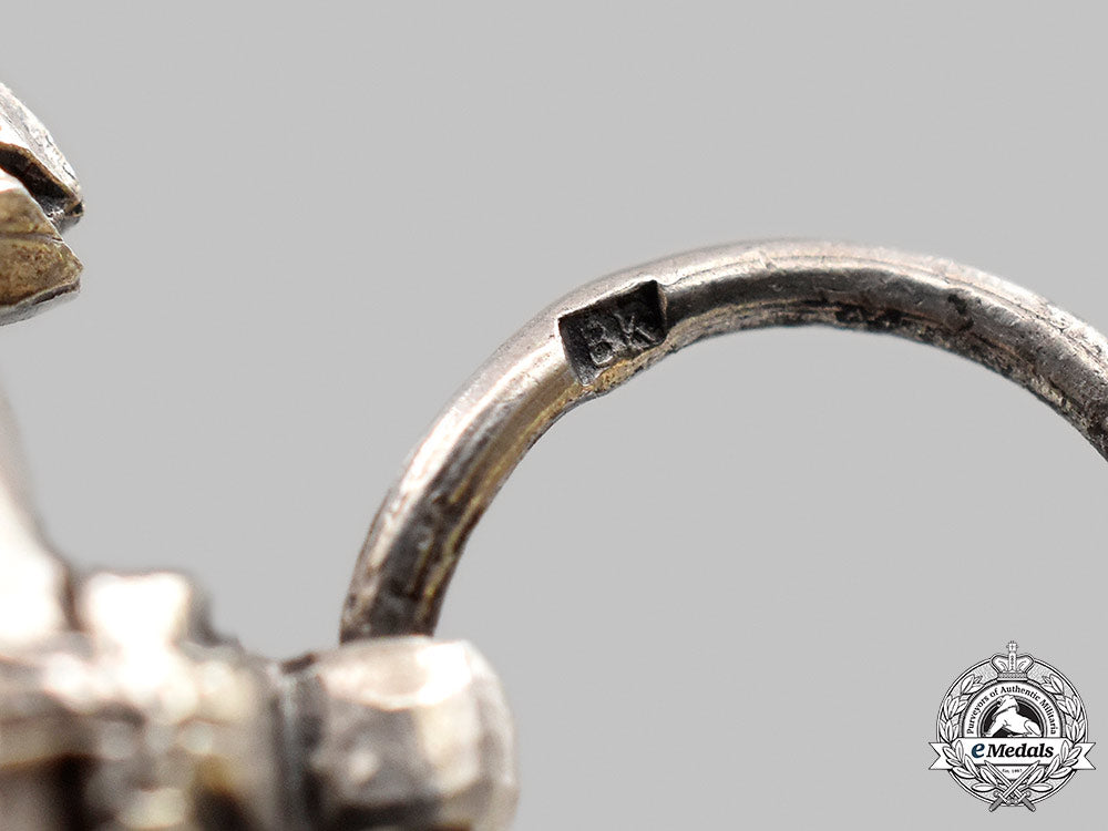 (Red krune kralja Zvonimira). Instituted in 1941. In silver, maker marked "BK" (Braća Knaus, Zagreb) on the ring and hallmarked with a Croatian goose flanked by a "III' at the left and an "A" at the right on the edge, measuring 32.5 mm (w) x 45 mm (h) inclusive of its crown suspension, edge nicks, on its original triangular war ribbon with hook and eye, near extremely fine.