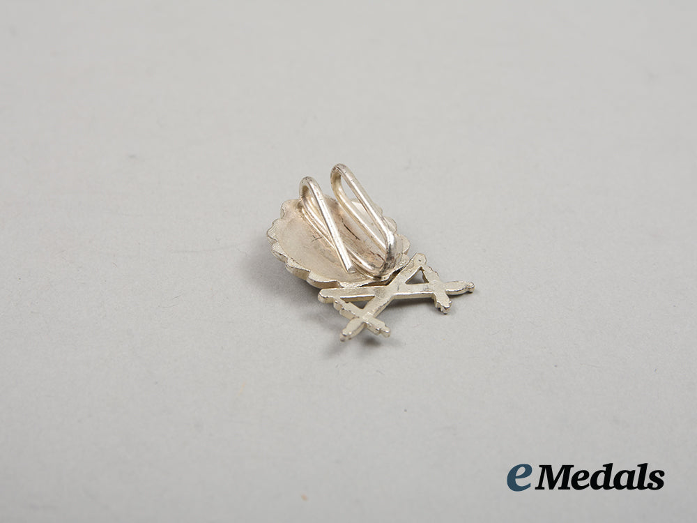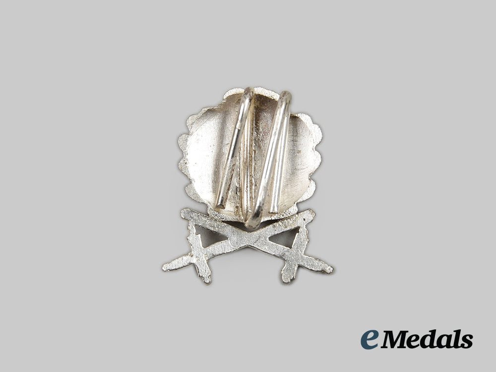 (Eichenlaub und Schwertern zum Ritterkreuz des Eisernen Kreuzes). Constructed of a silvered alloy, the obverse consisting of three overlapping oak leaves situated above a pair of crossed swords, the reverse retaining two malleable attachment prongs retaining a period original shortened length of neck ribbon, unmarked, measuring 24.56 mm (w) x 28.13 mm (h), in extremely fine condition.